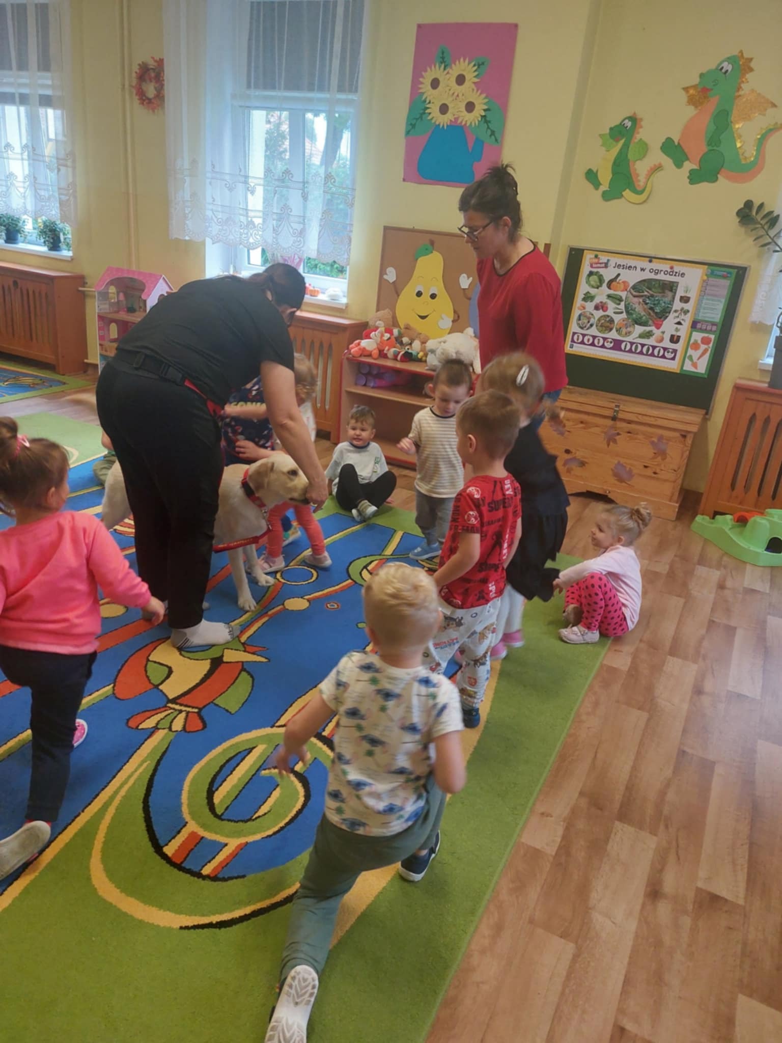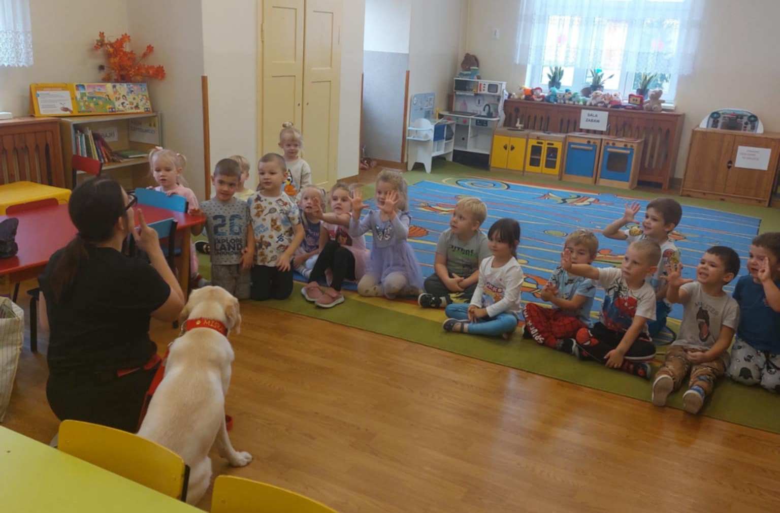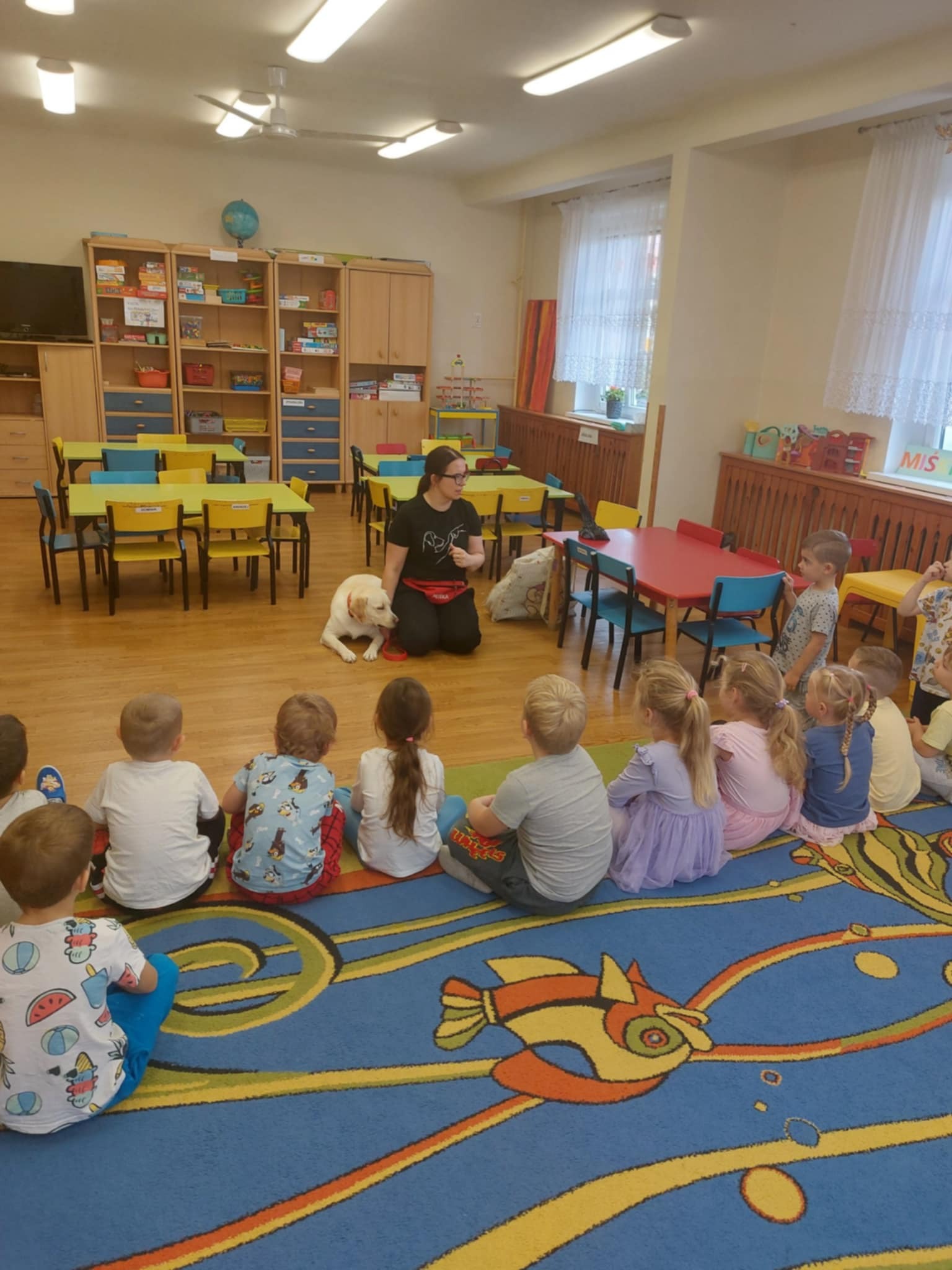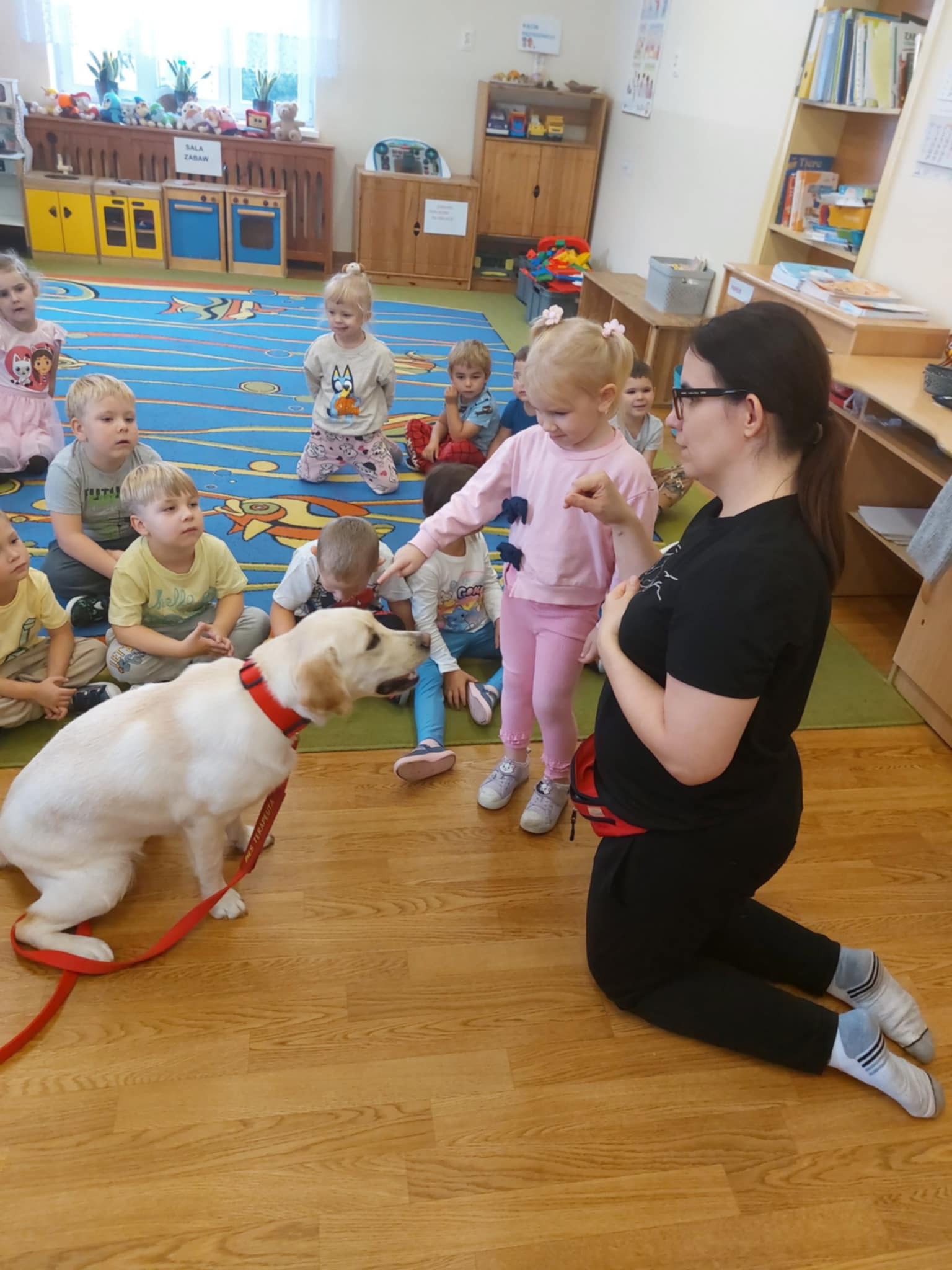 Spotkanie ze szkolonym do kontaktów z dziećmi pieskiem Misią i jej opiekunką pani Ewą. W zajęciach brały udział wszystkie przedszkolne grupy.