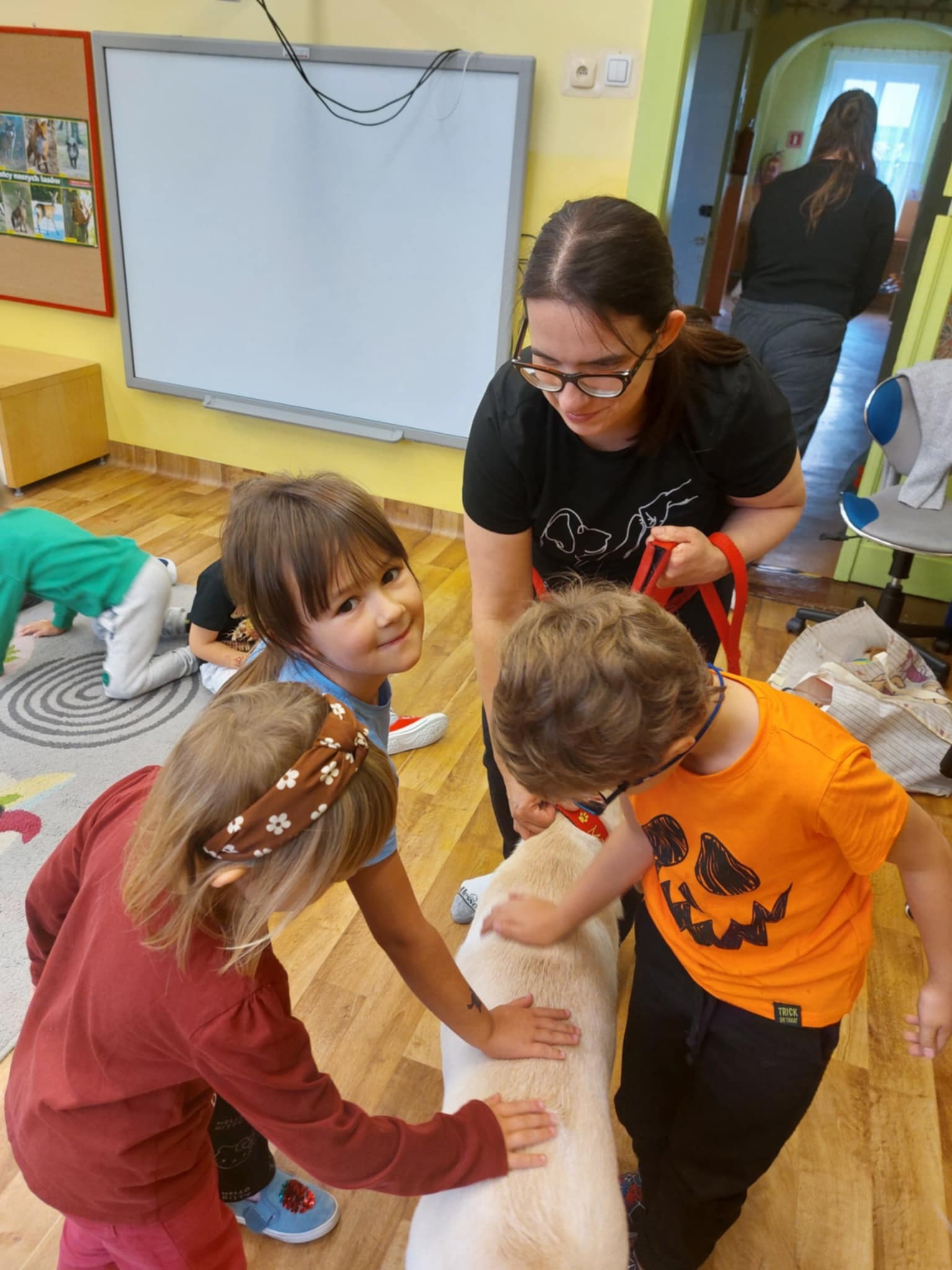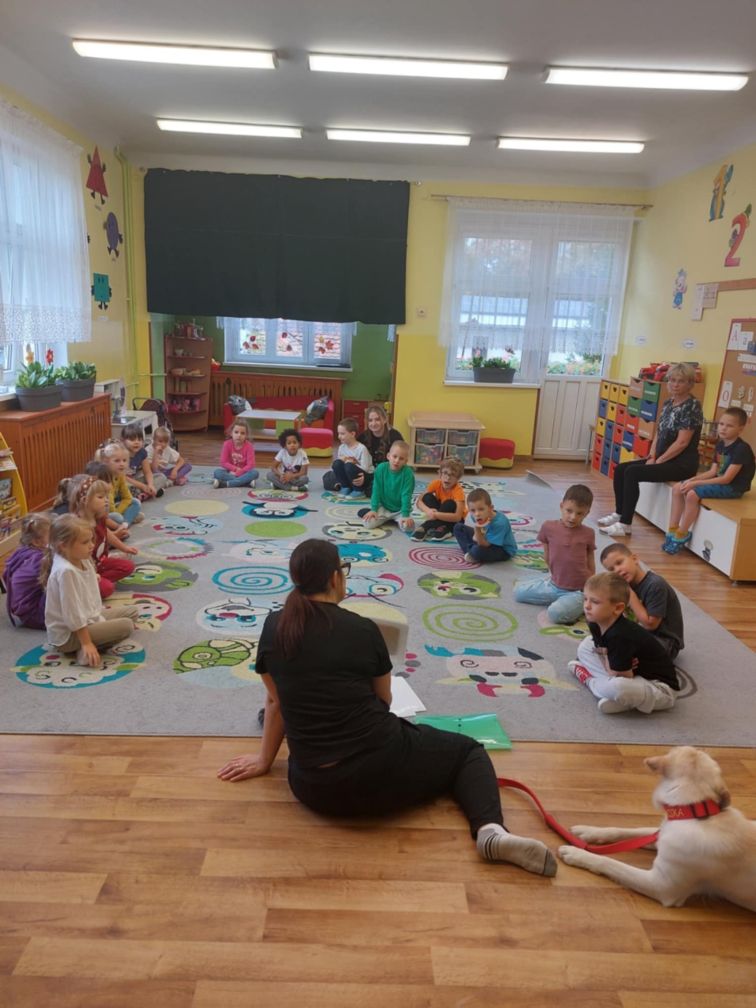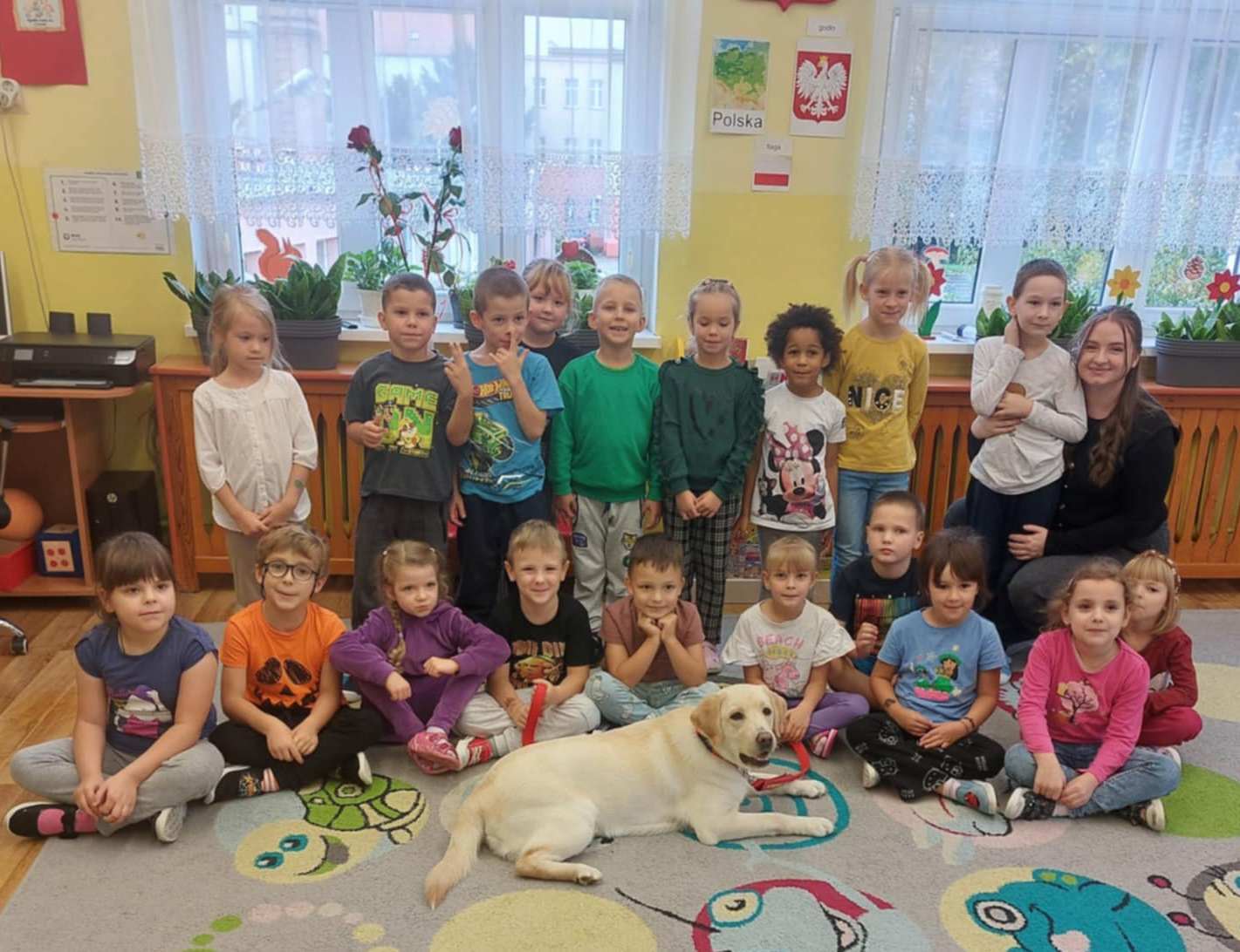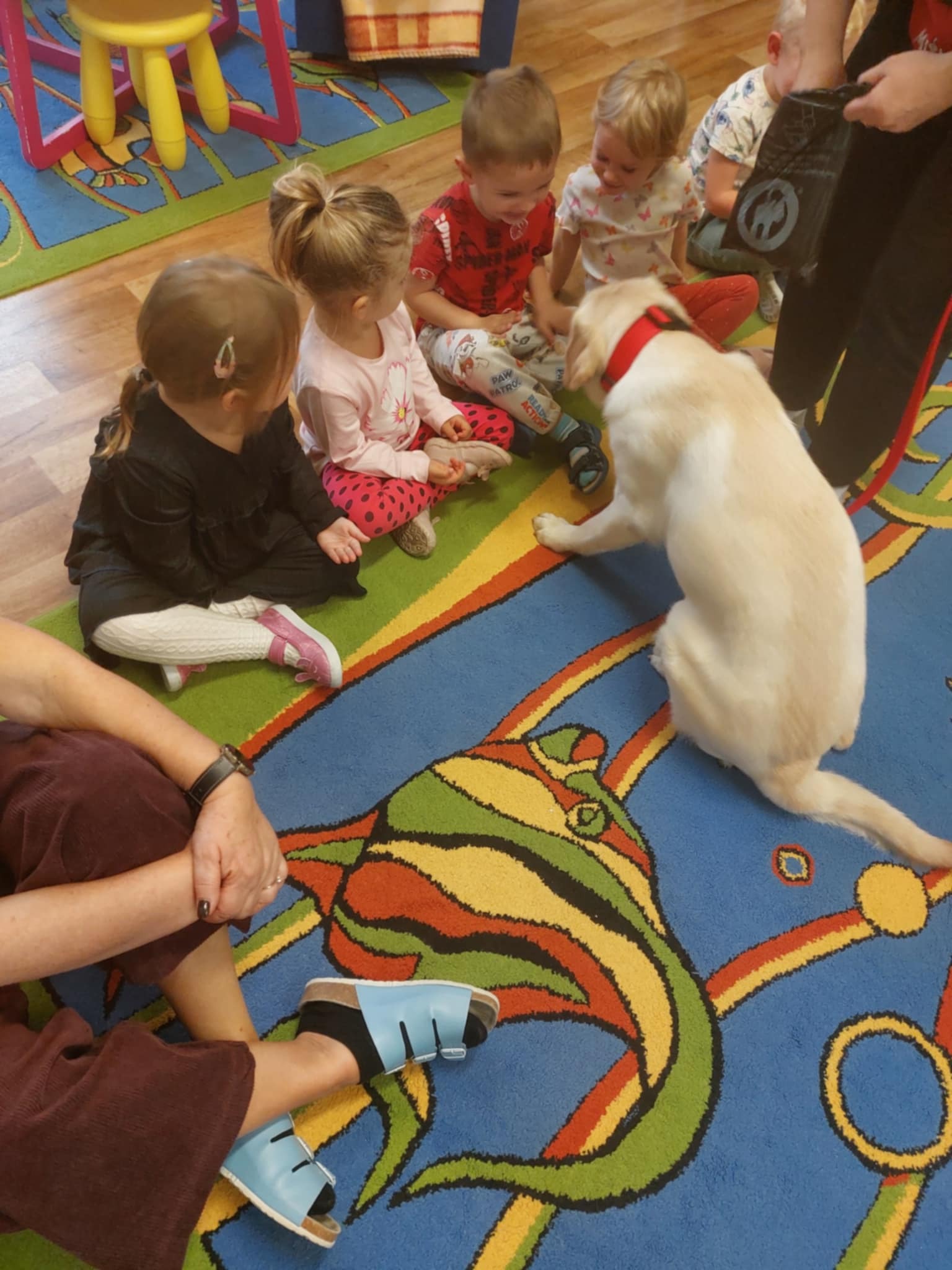 Spotkanie ze szkolonym do kontaktów z dziećmi pieskiem Misią i jej opiekunką pani Ewą. W zajęciach brały udział wszystkie przedszkolne grupy.