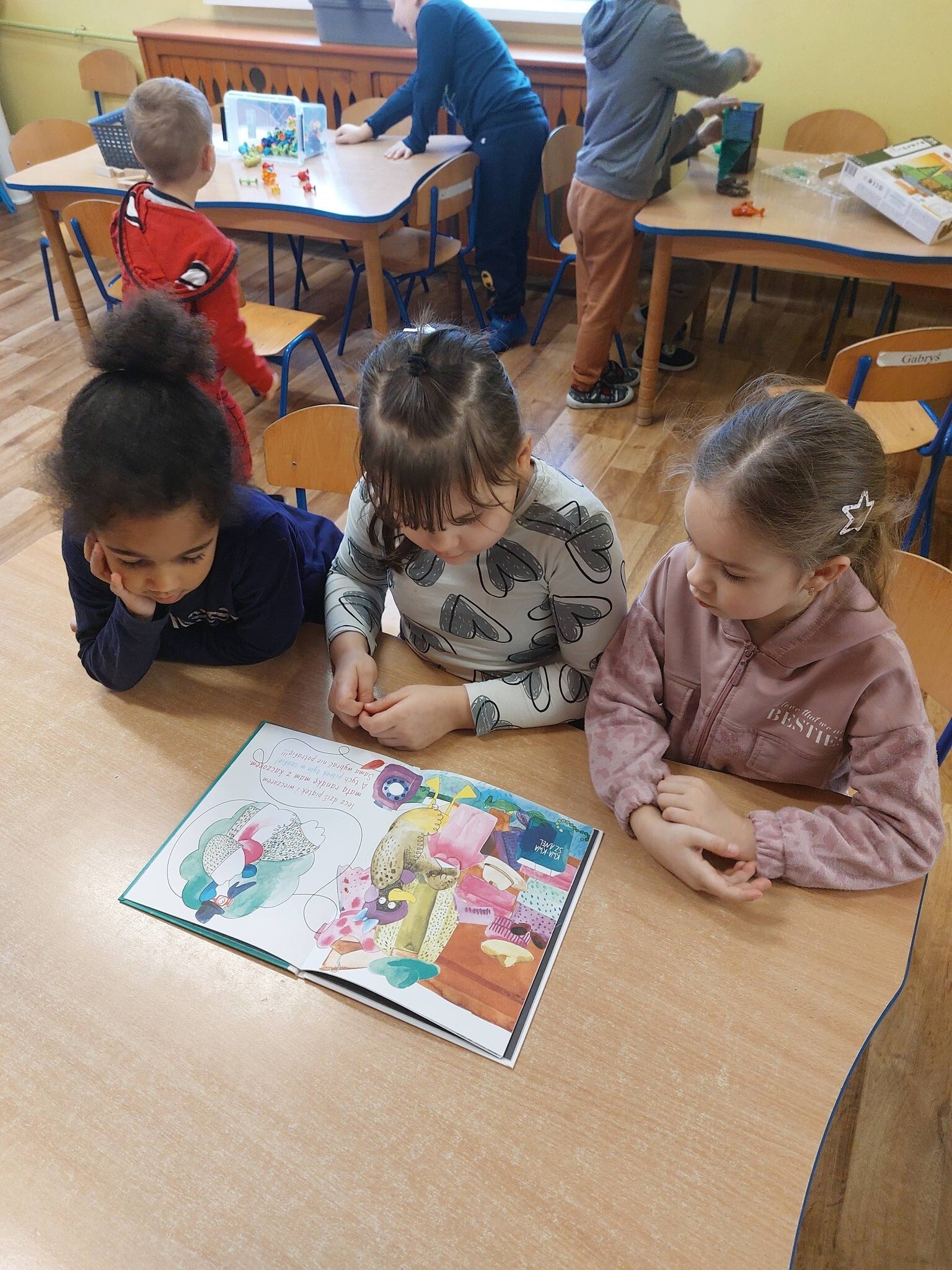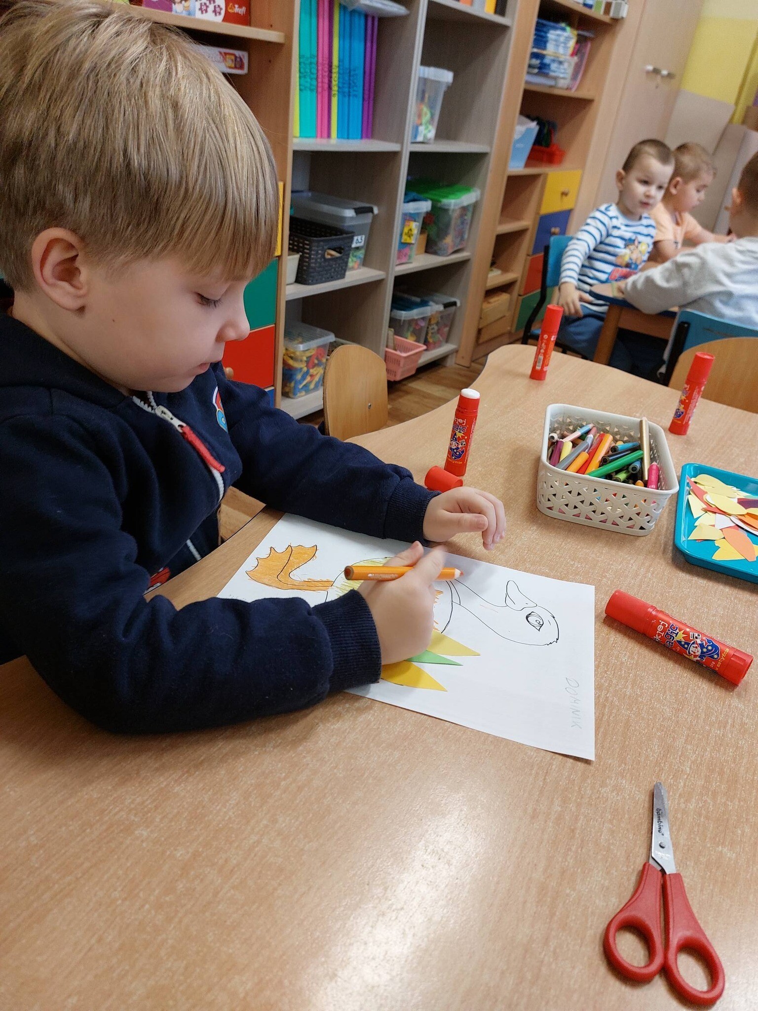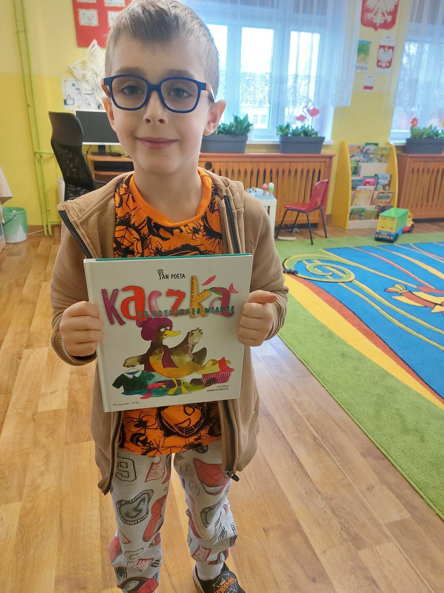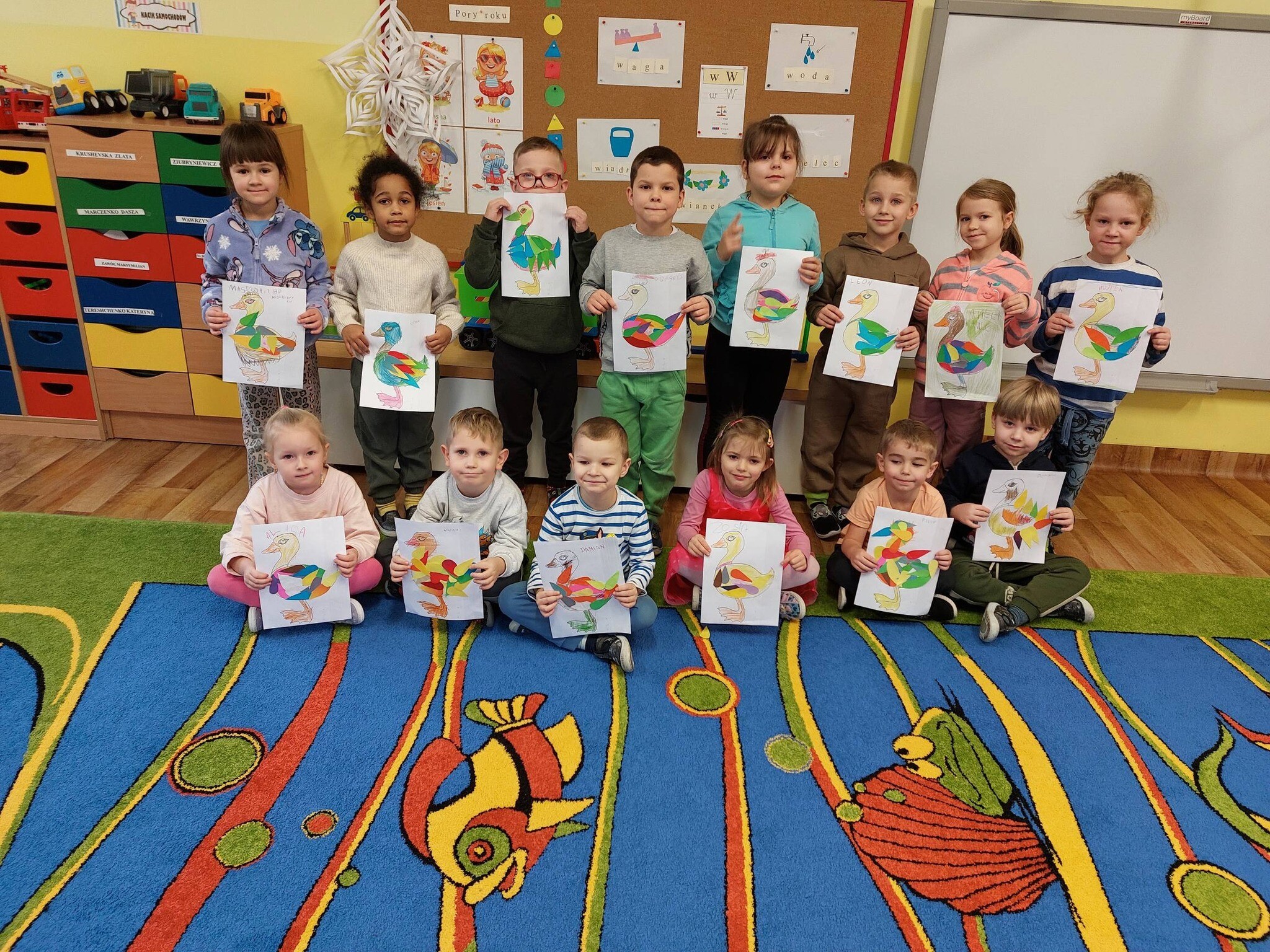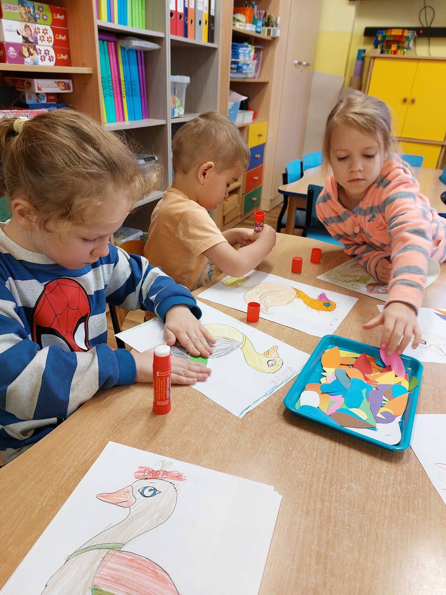 ,, Kaczka co przebrała miarę'' - Pana Poety inspiracją dla ,,Sówek'' i ,,Miśków'' do pracy plastycznej. Dzieci zrozumiały że mało istotny jest ubiór, bardziej istotne jest to jacy my sami jesteśmy.