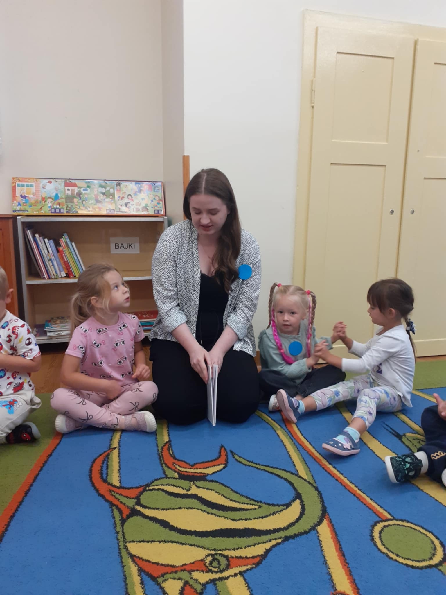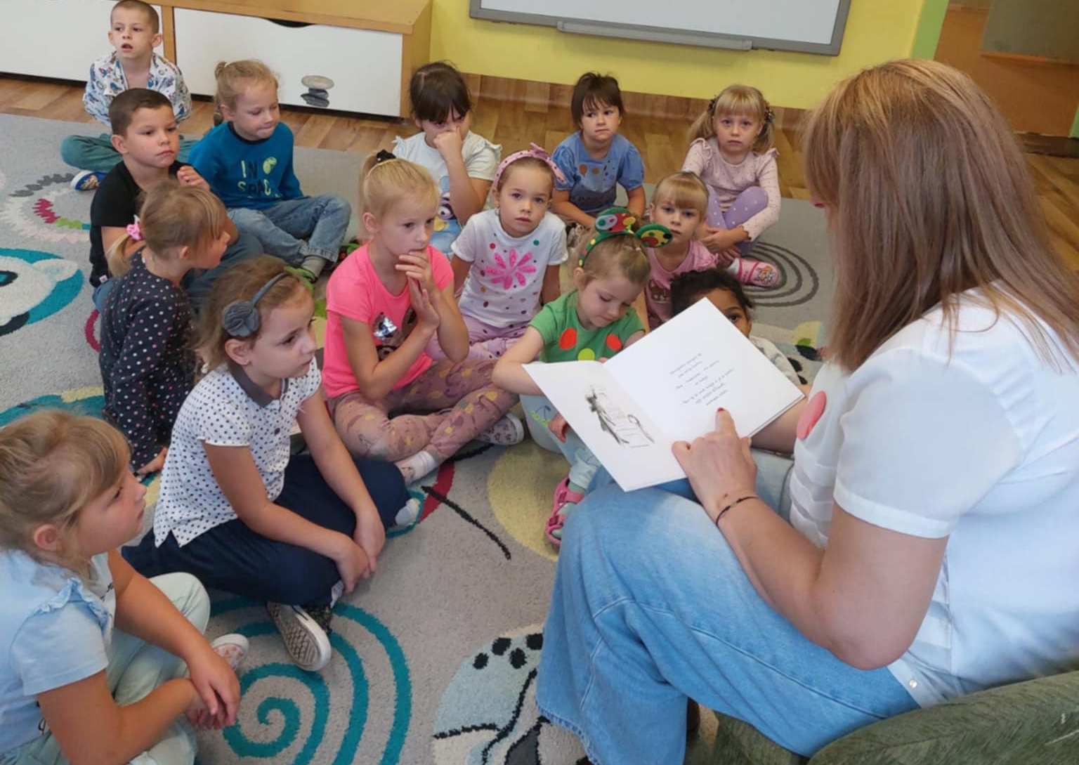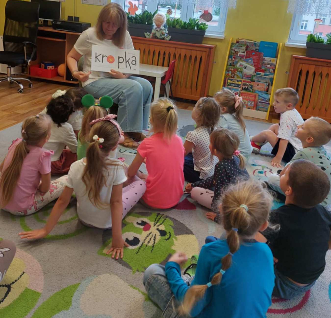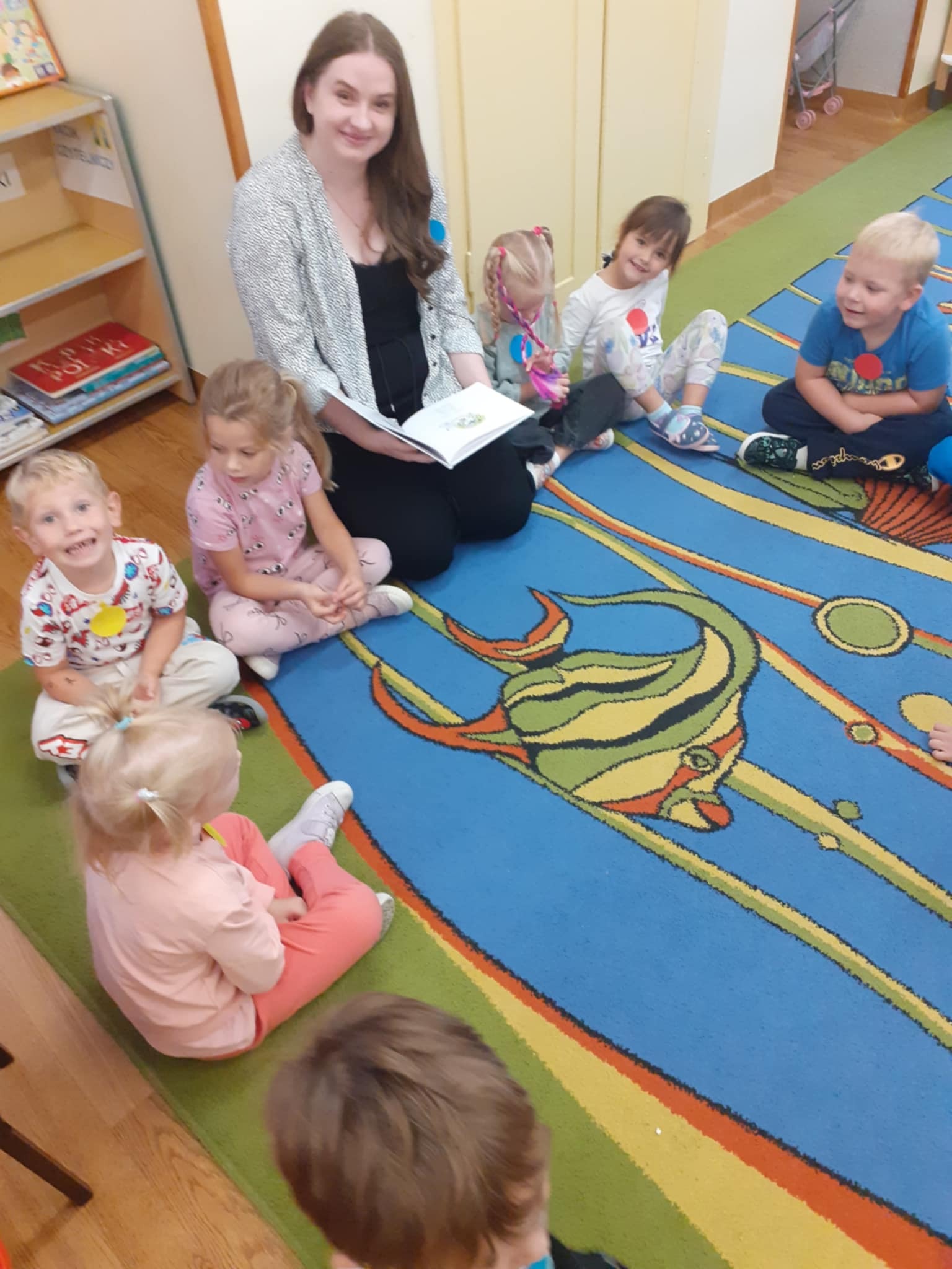 W związku z realizowanym w przedszkolu tygodniem Dnia kropki, książkę czytają: w grupie Miśki - logopeda Weronika Żmijewska, w grupie Sówki - dyrektor Beata Łagocka.