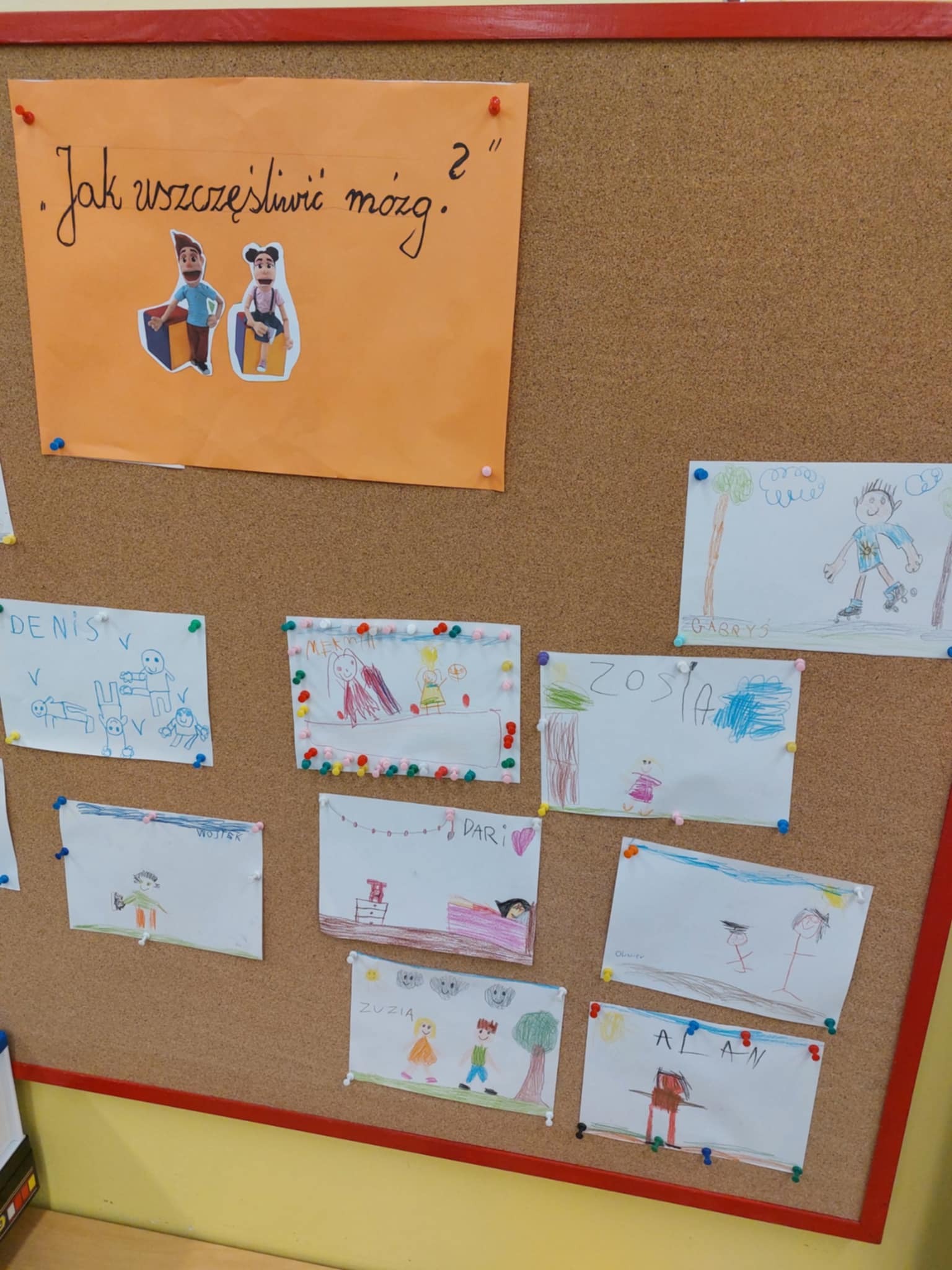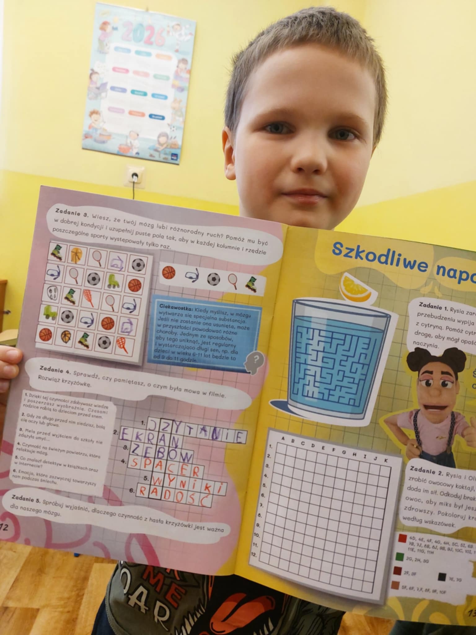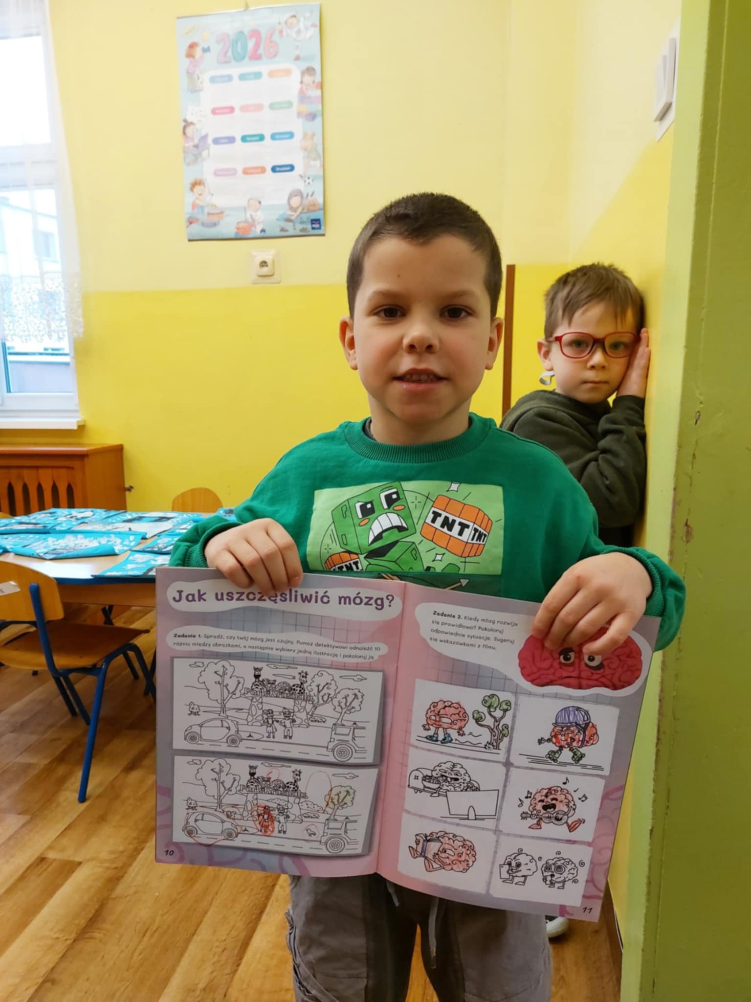 Zabawy ruchowe. Obrazkowe przedstawienie poznanych wskazówek i rad - "Jak uszczęśliwić mózg?".Praca w książkach.