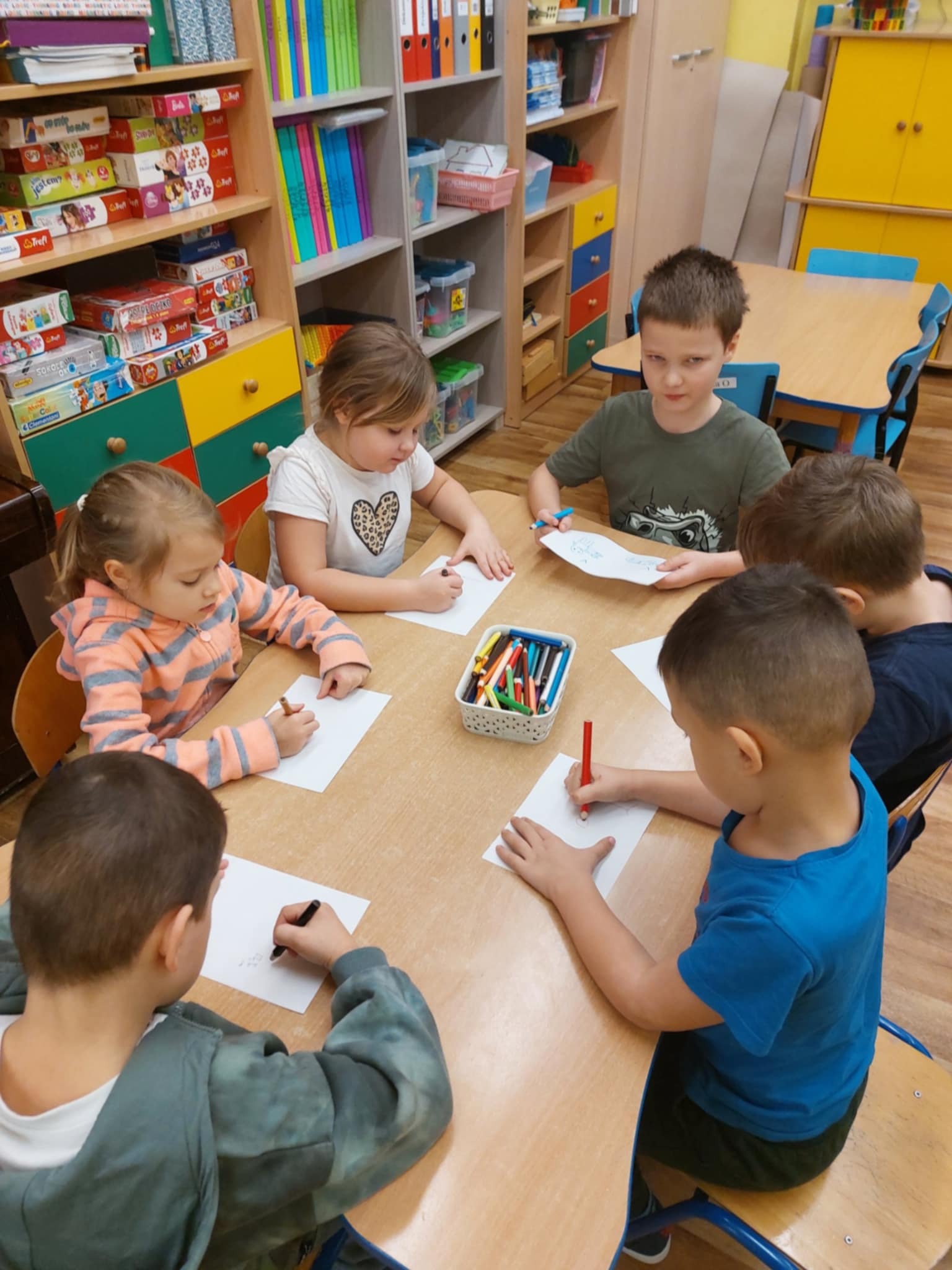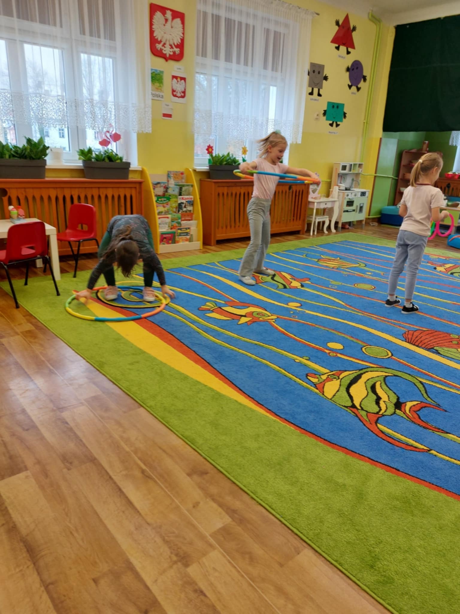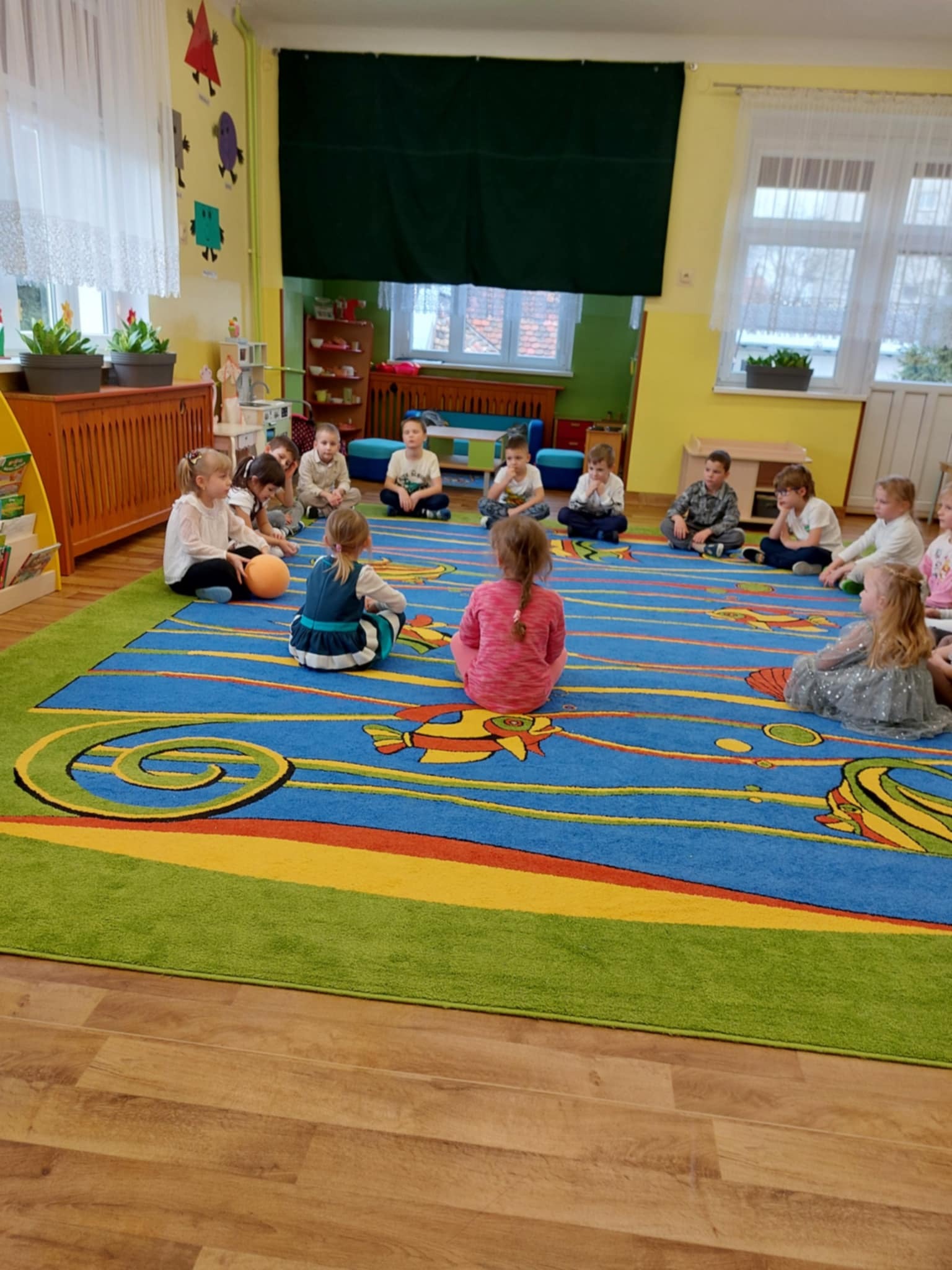 Zabawa pantomimiczna: "Dzień dobry Królu Lulu" - polegająca na pokazywaniu przez dzieci różnych miejsc i wykonywanych w tym miejscu czynności np pływanie na basenie, zbieranie grzybów w lesie itp. - oraz odgadywanie przez jedno dziecko 'Króla" tych czynności.