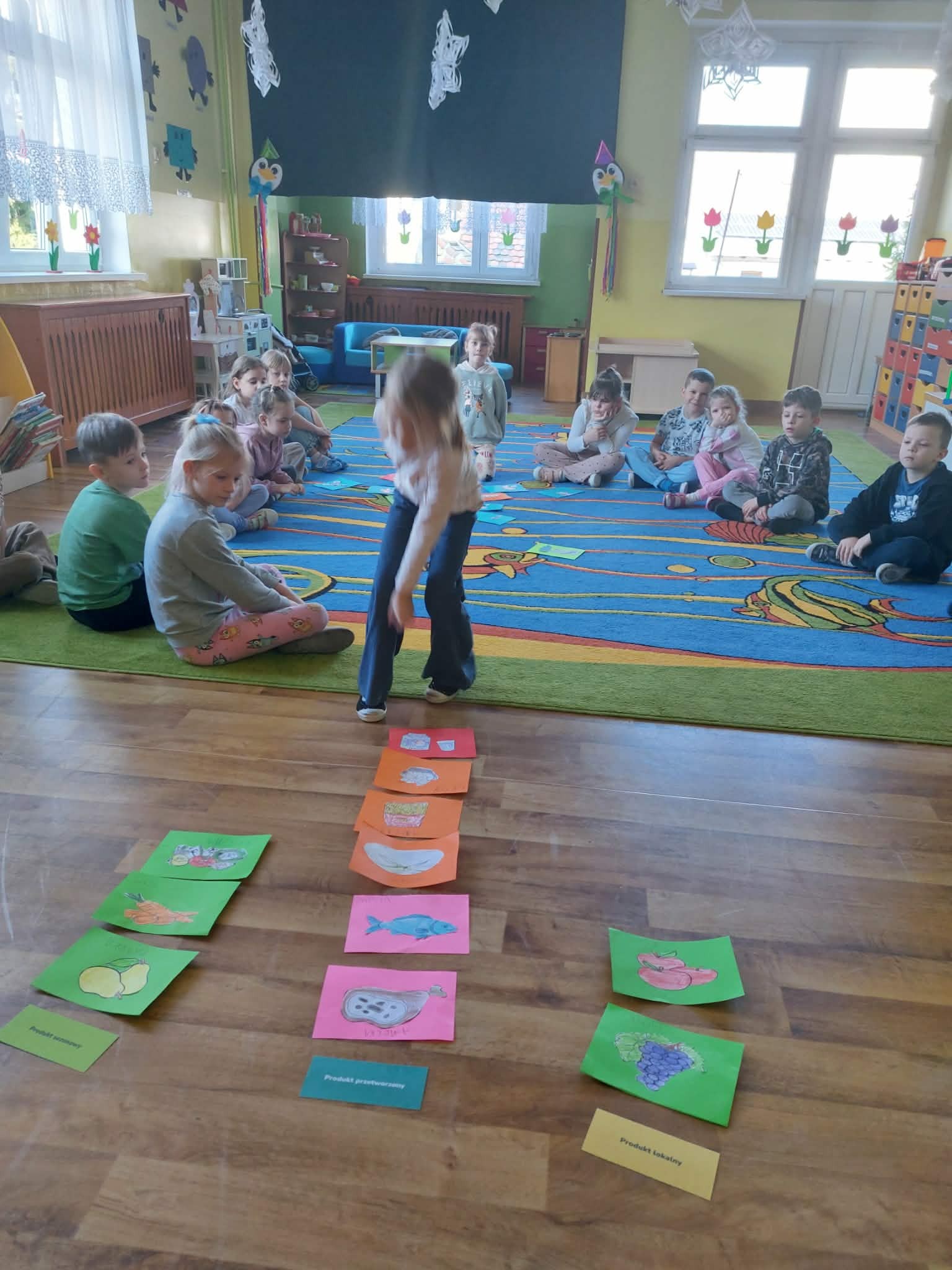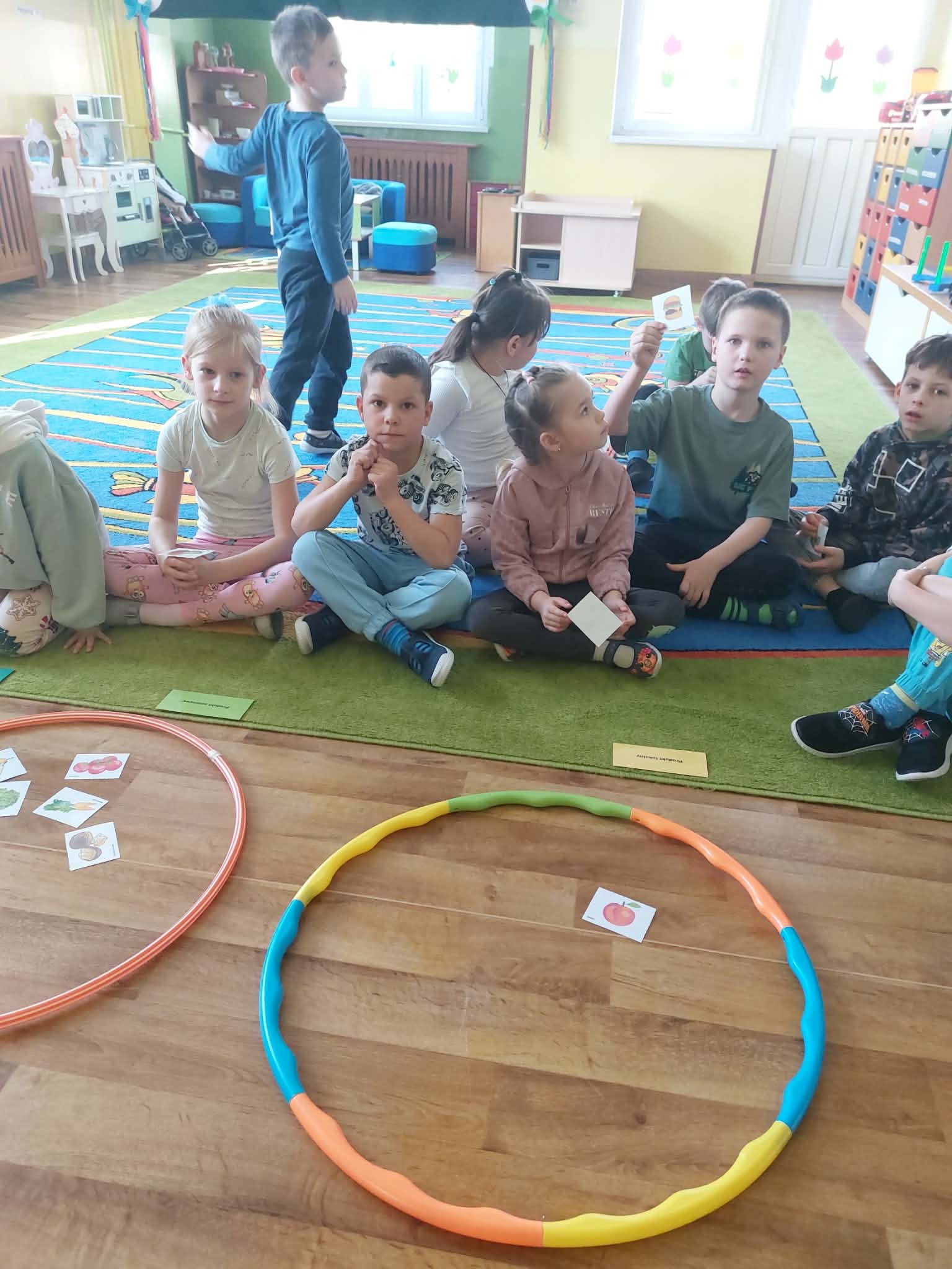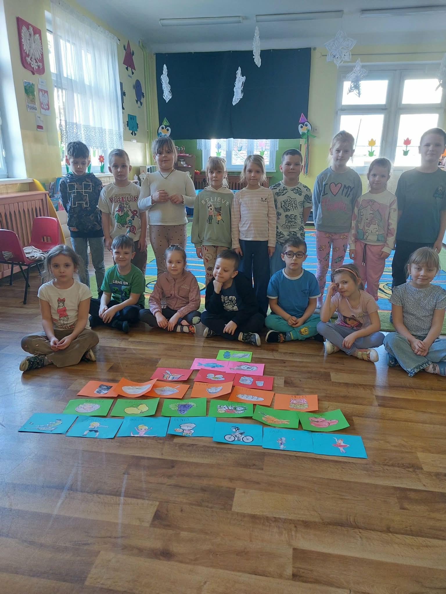 "Sówki" poznają podstawy prawidłowego żywienia. Uczą się rozpoznawać, nazywać i klasyfikować produkty spożywcze ze względu na: produkty lokalne, produkty sezonowe, produkty przetworzone. Praca plastyczna: "Najbardziej lubię robi...., najbardziej lubię jeść...". Jest też czas na zabawy ruchowe.
