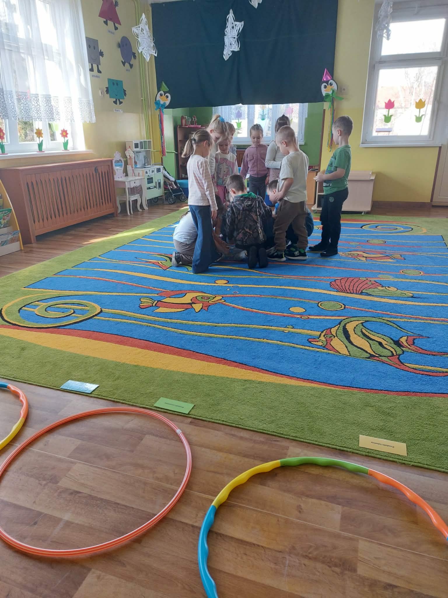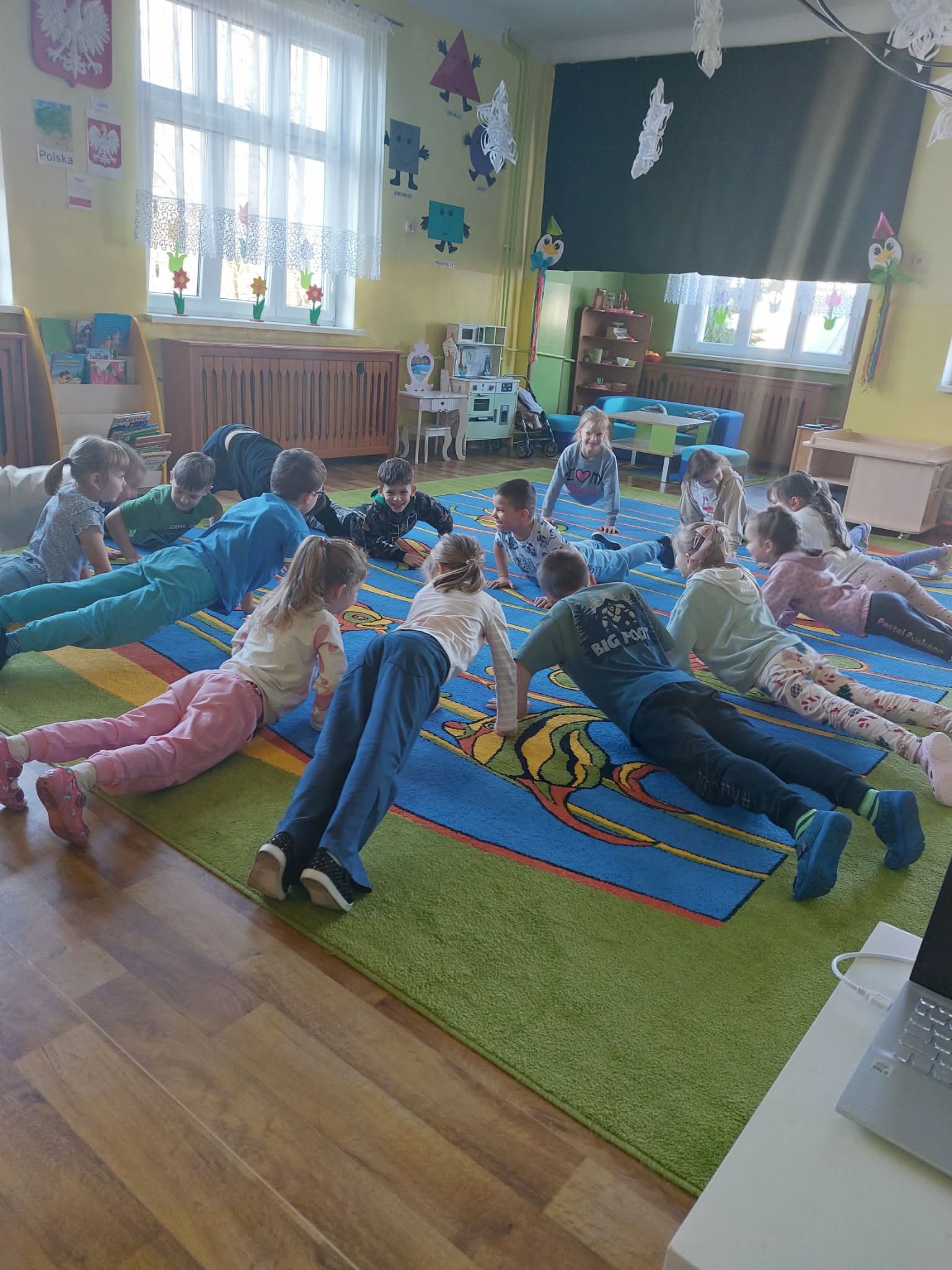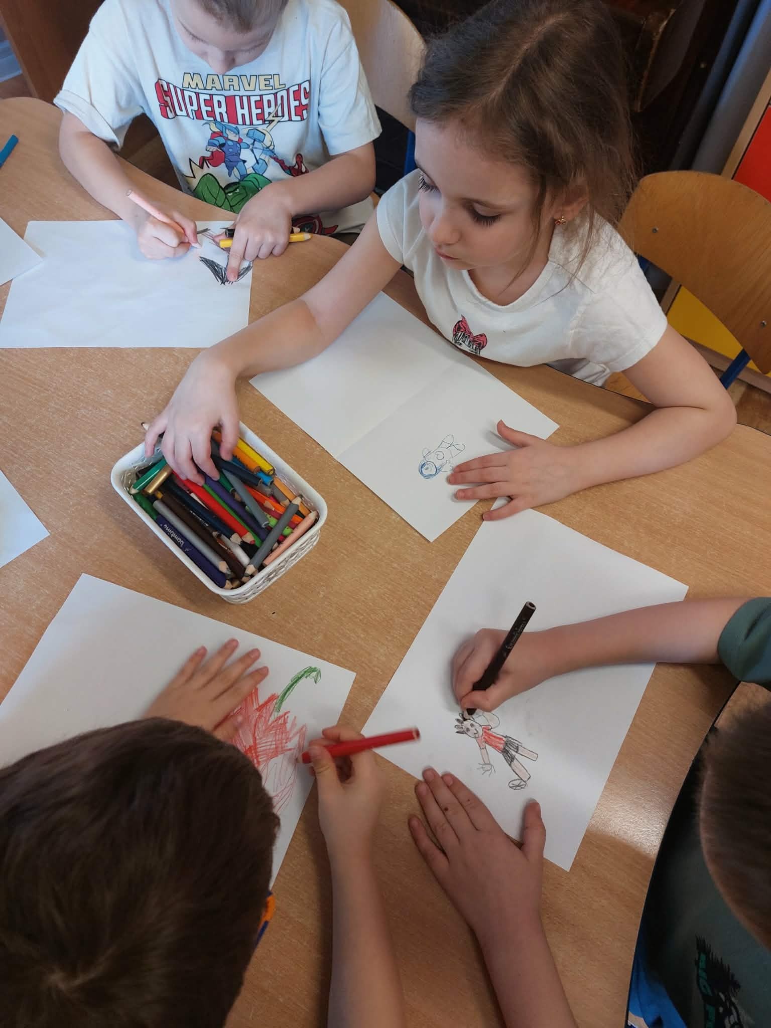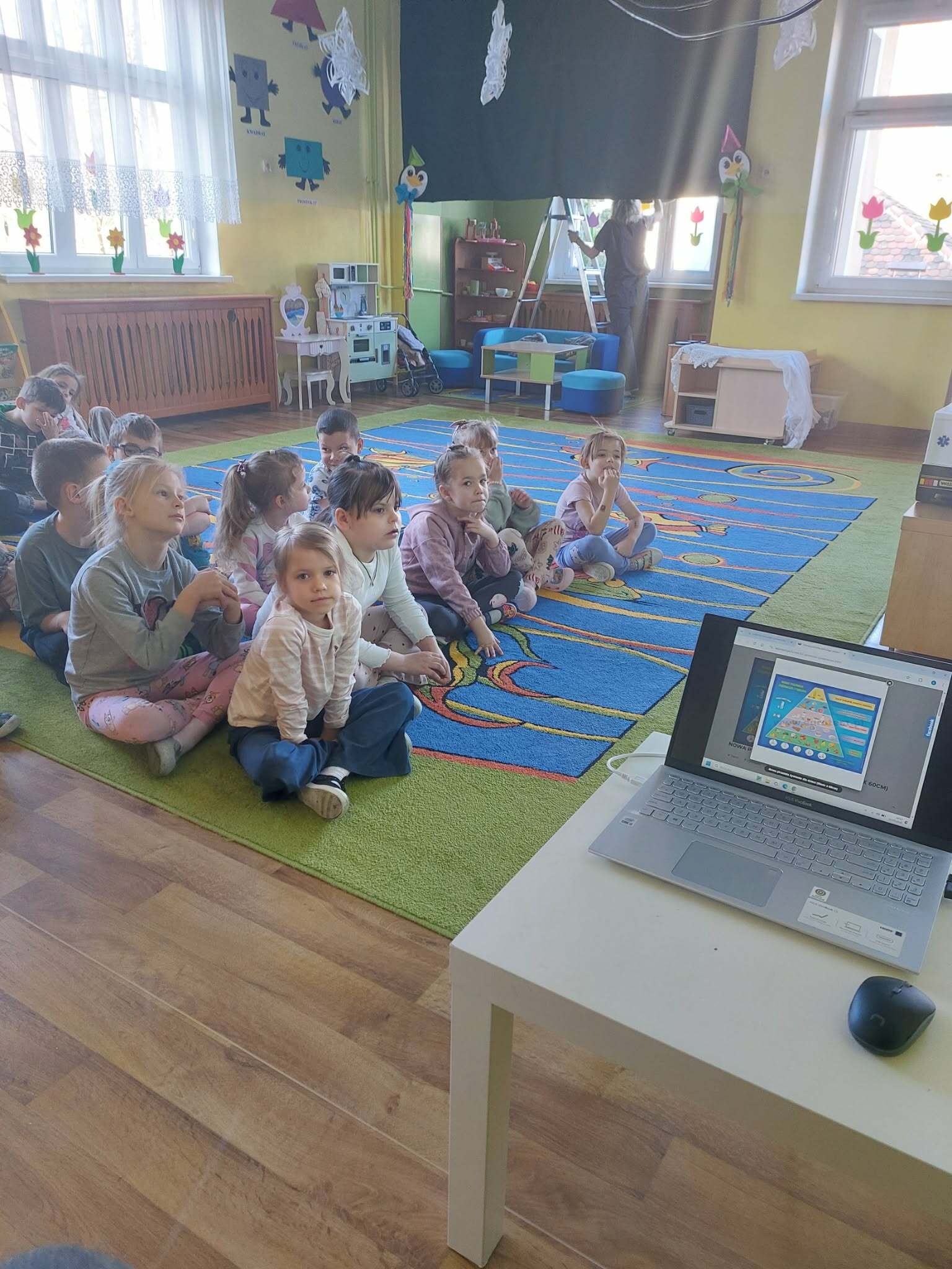 "Sówki" poznają podstawy prawidłowego żywienia. Uczą się rozpoznawać, nazywać i klasyfikować produkty spożywcze ze względu na: produkty lokalne, produkty sezonowe, produkty przetworzone. Praca plastyczna: "Najbardziej lubię robi...., najbardziej lubię jeść...". Jest też czas na zabawy ruchowe.