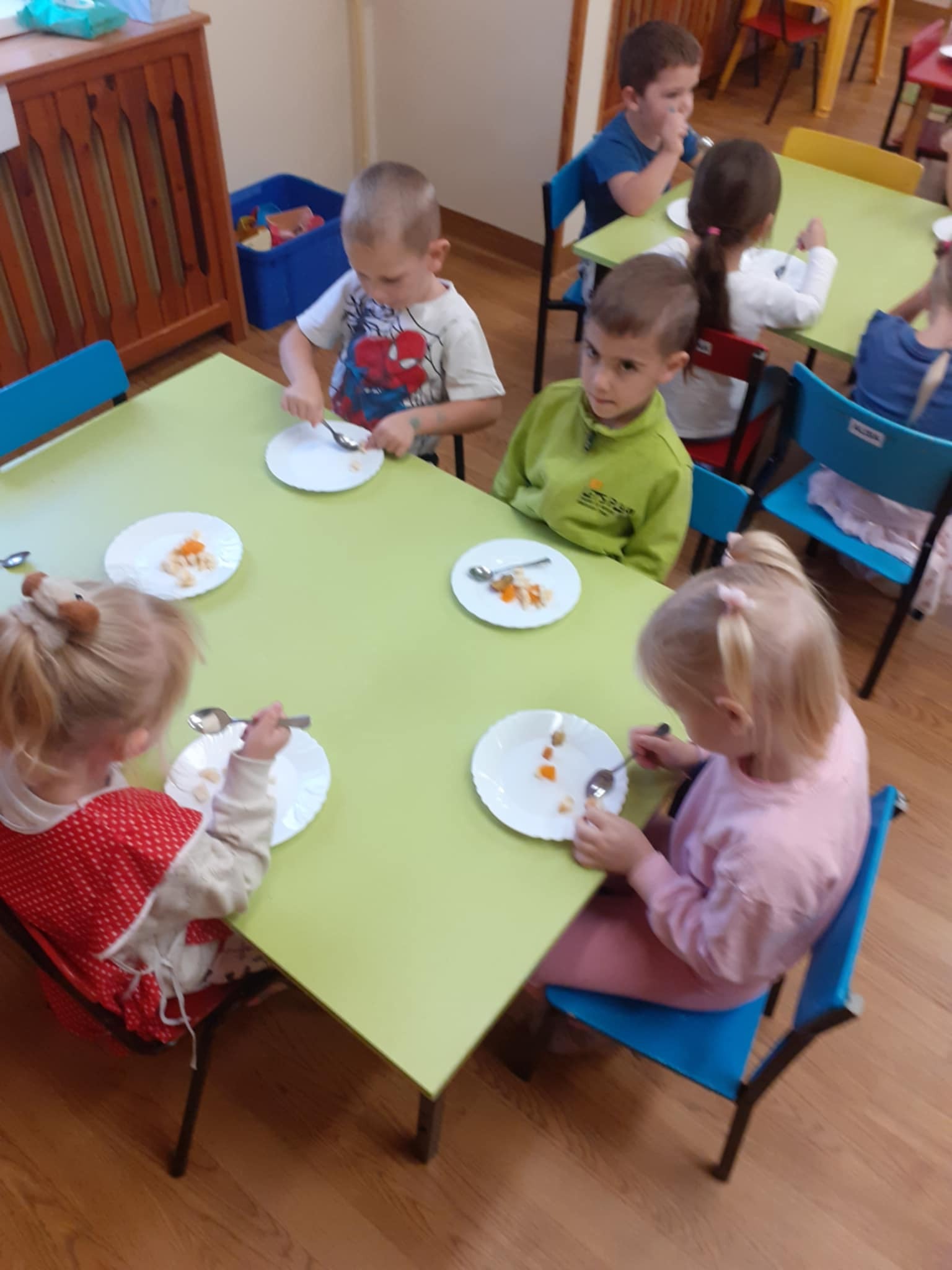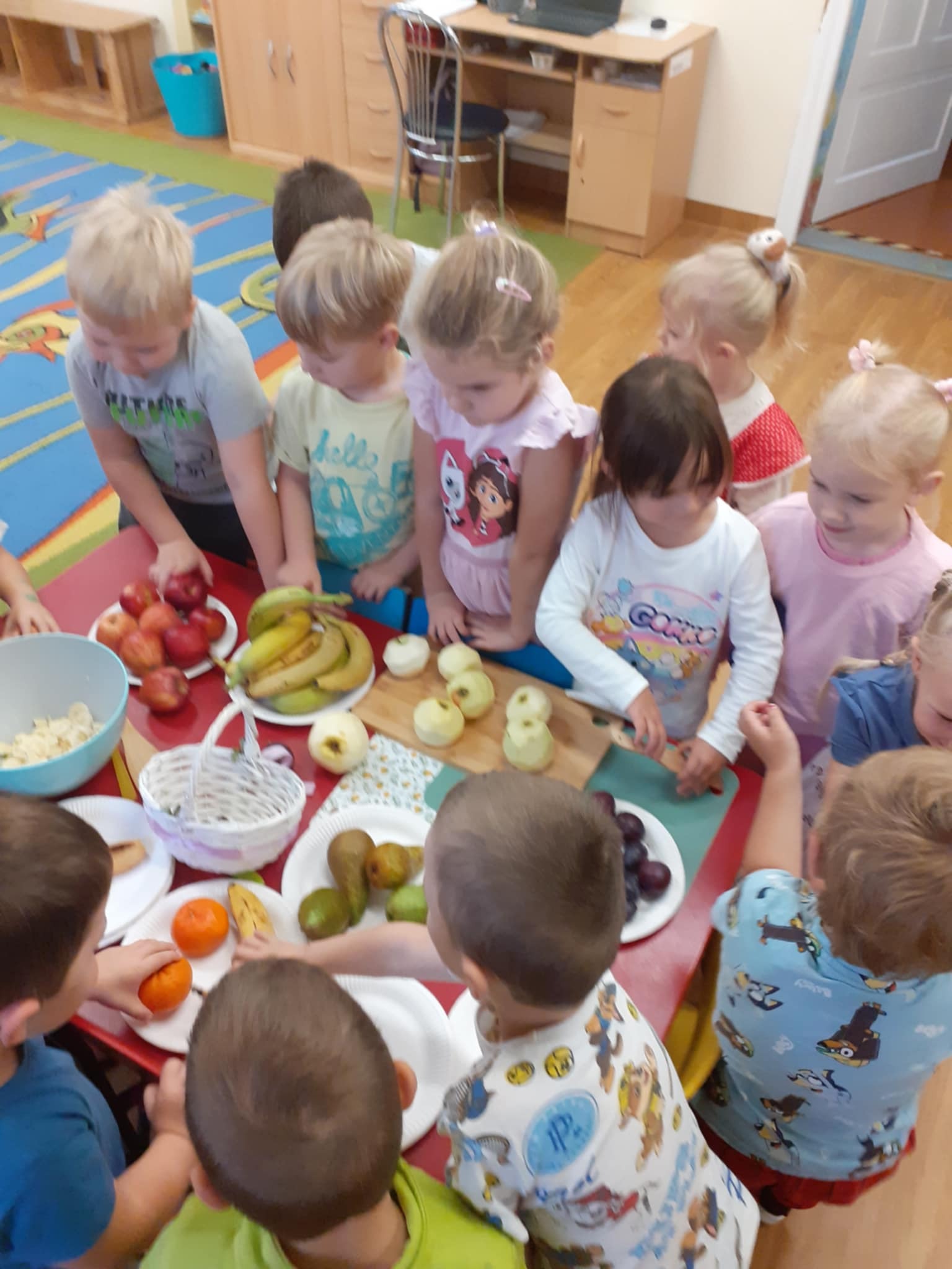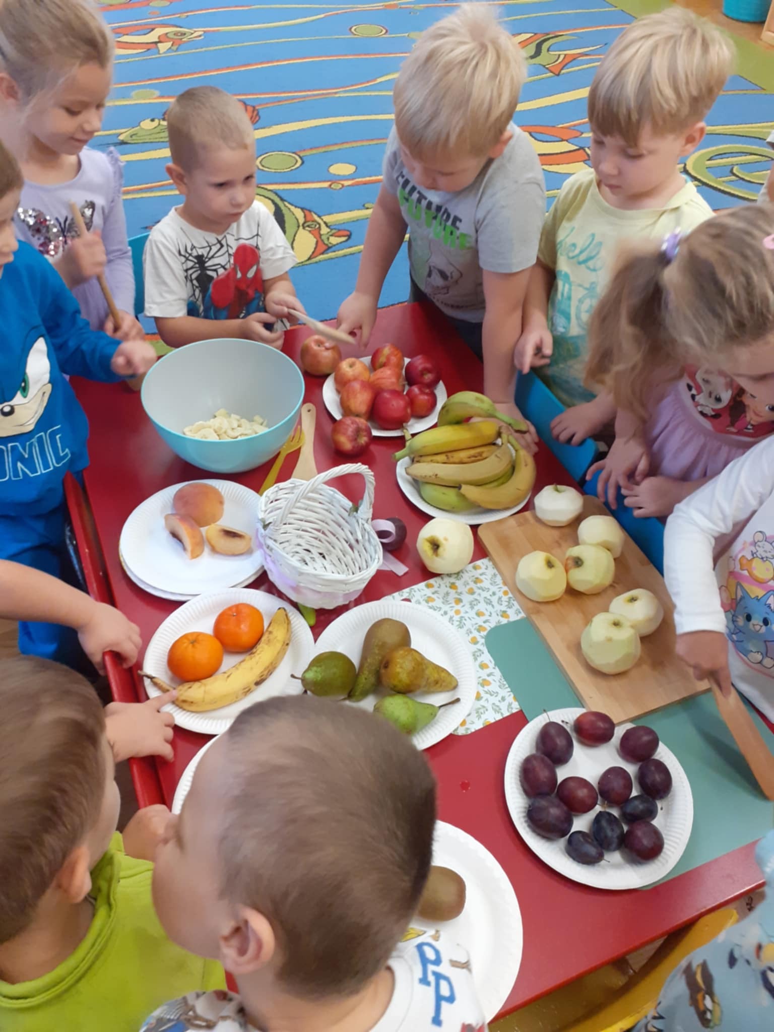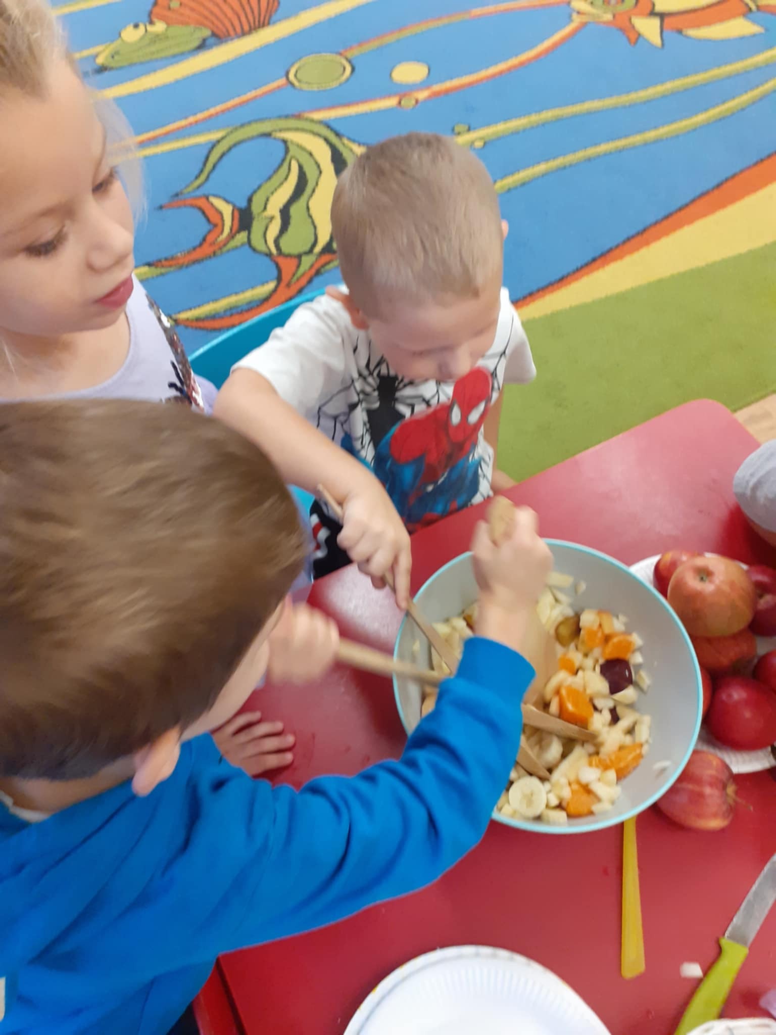Miśki przygotowywały i degustowały sałatkę owocową, związaną z tematem tygodnia " Kody jesieni"