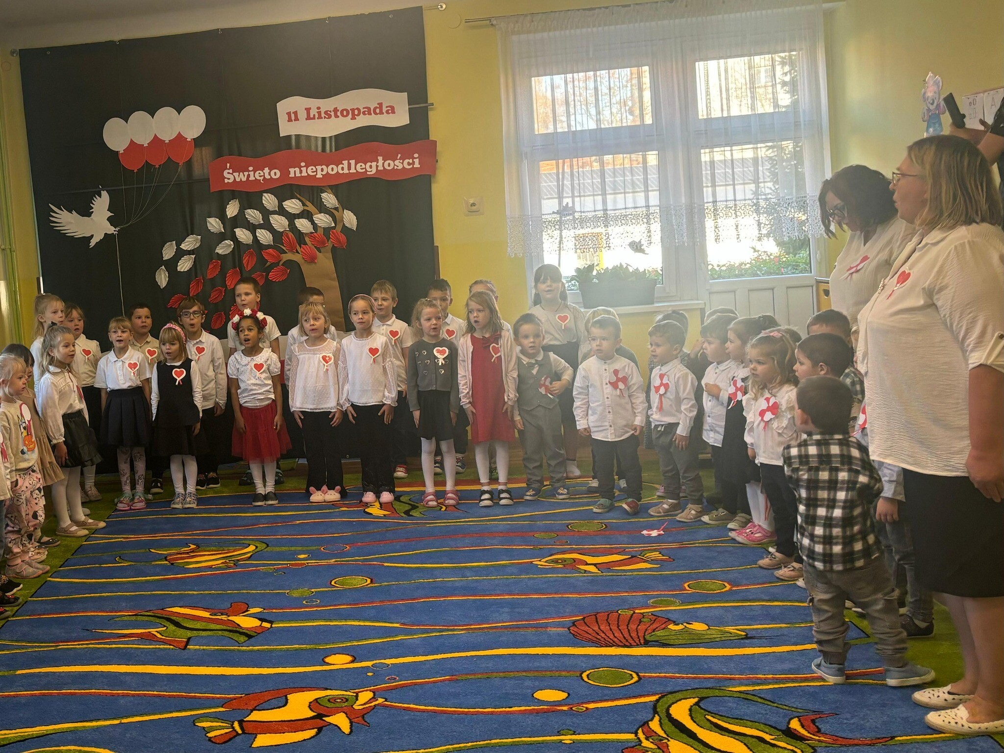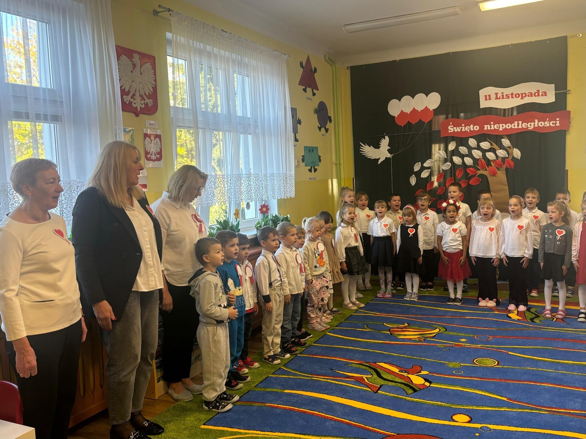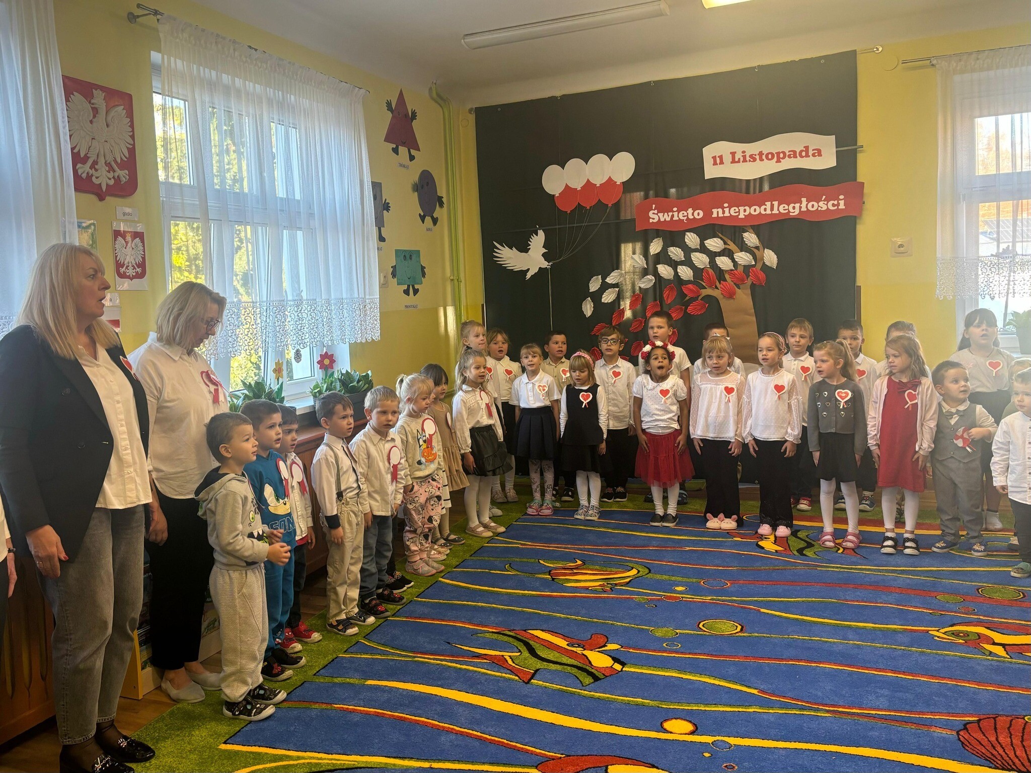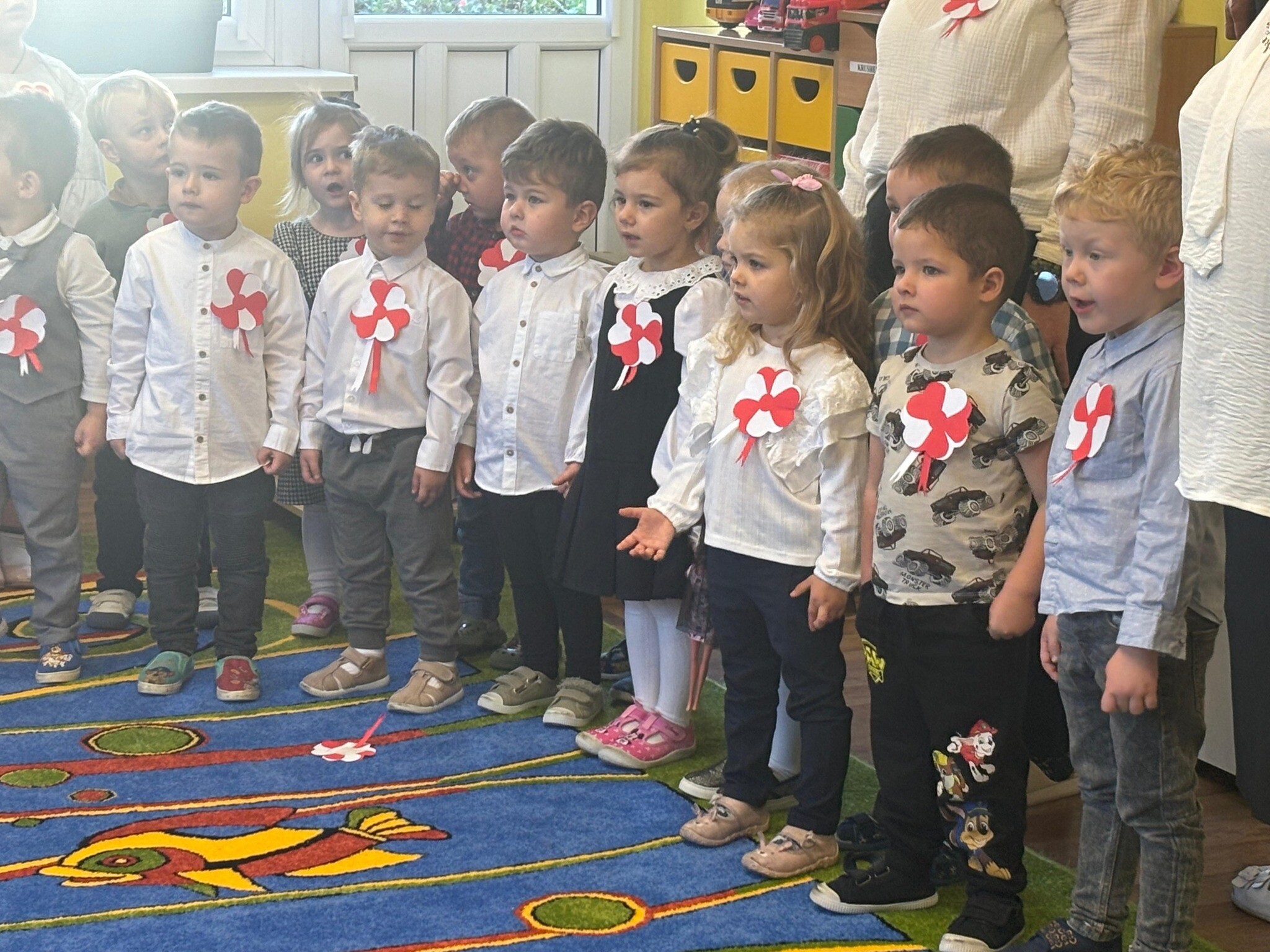 Uroczyste odśpiewanie hymnu w przedszkolu. Wyjście oraz udział dzieci z grupy ,, Sówki '' w uroczystościach przy Pomniku Bohaterów Walk o Polskę.
