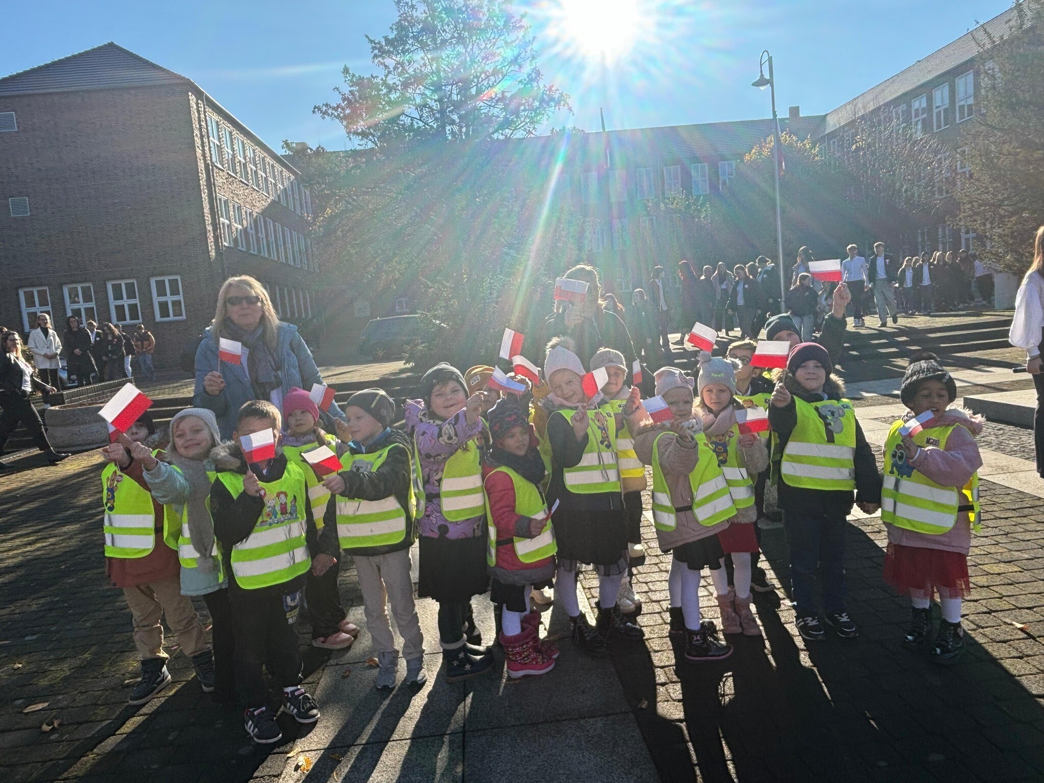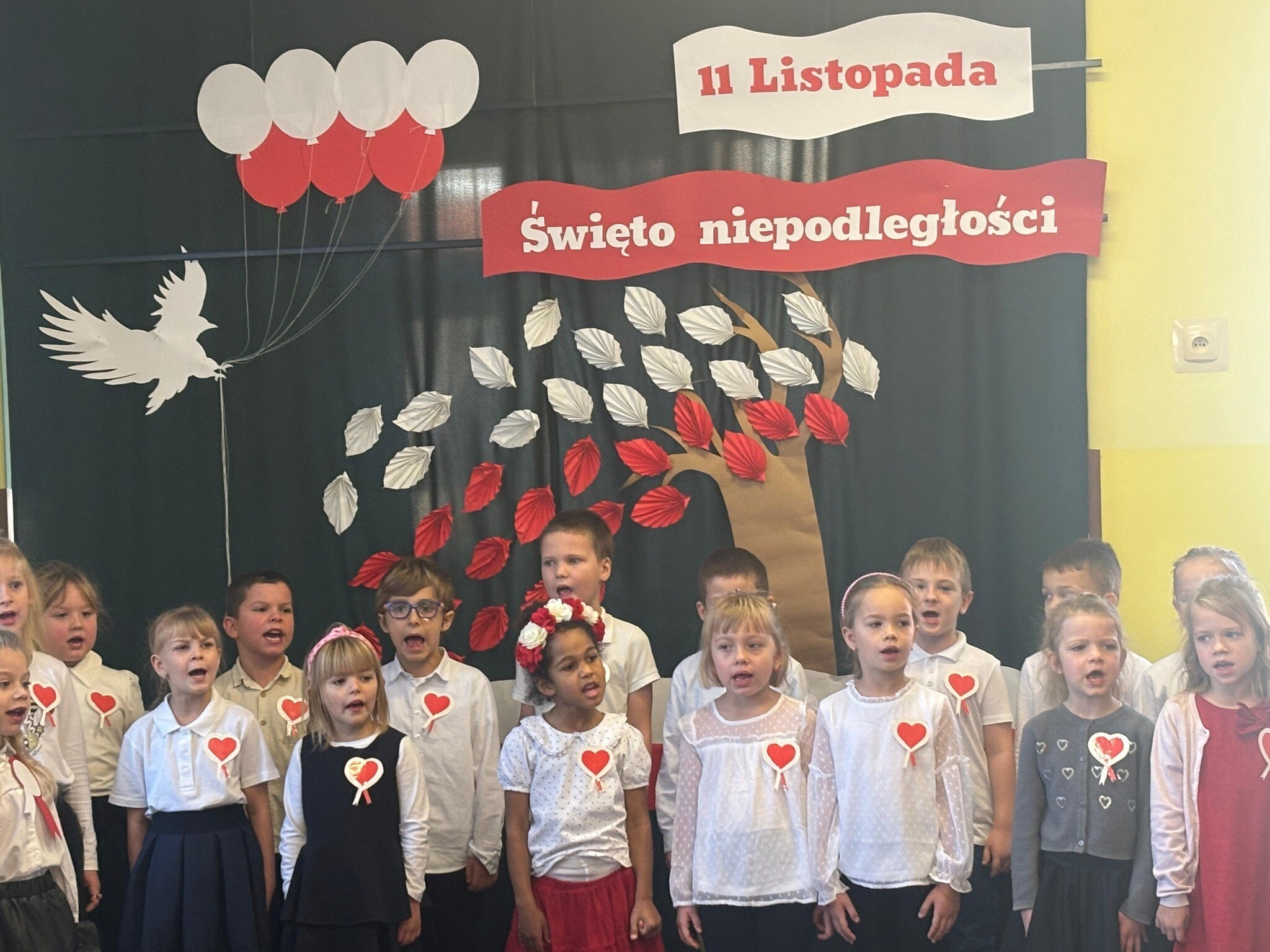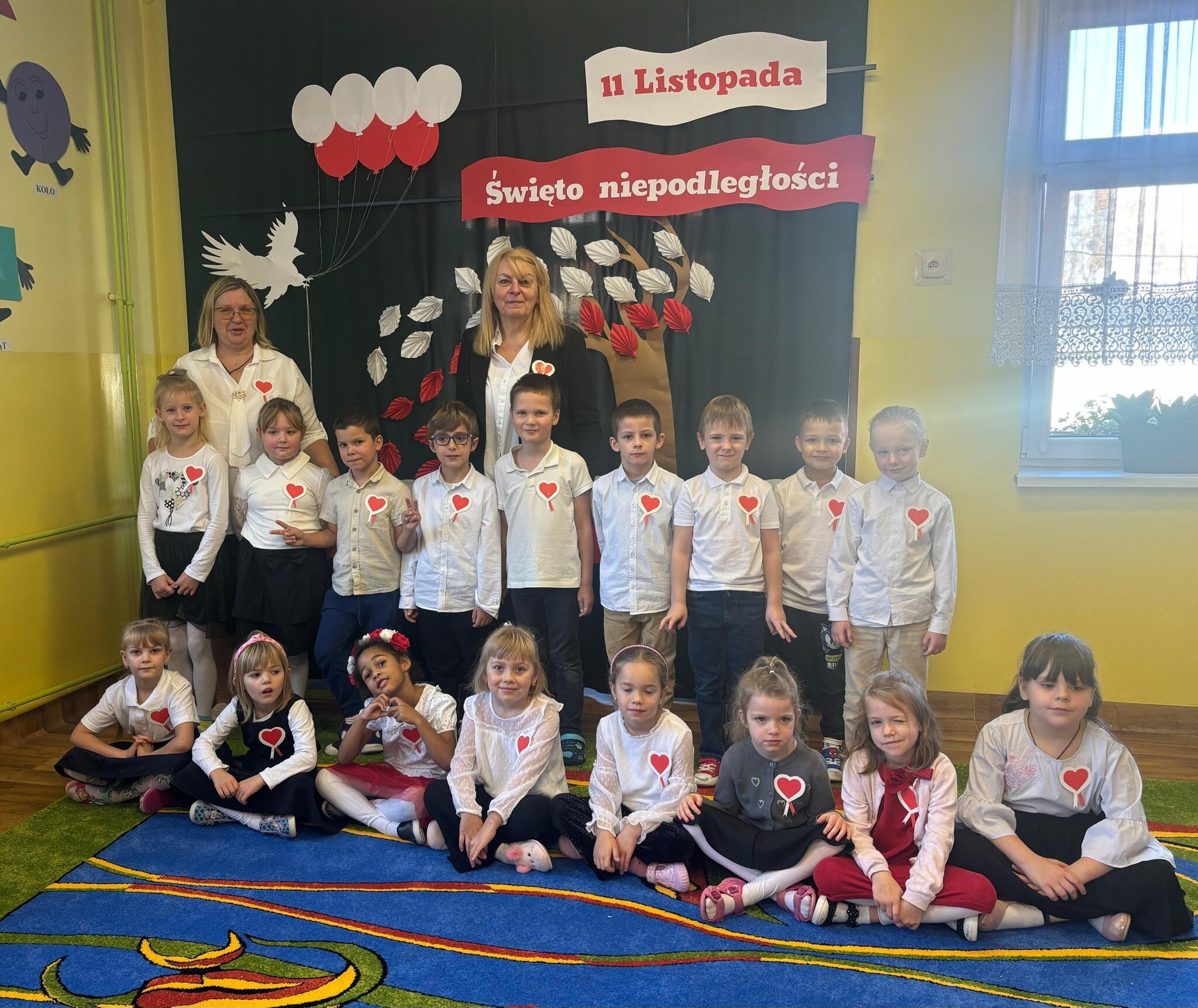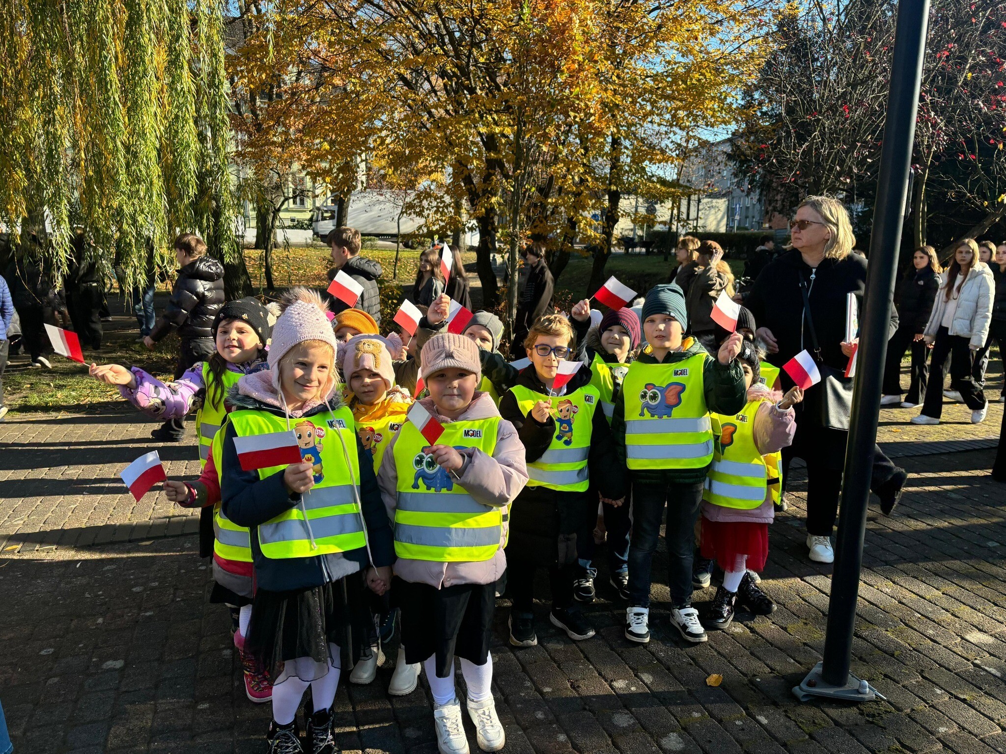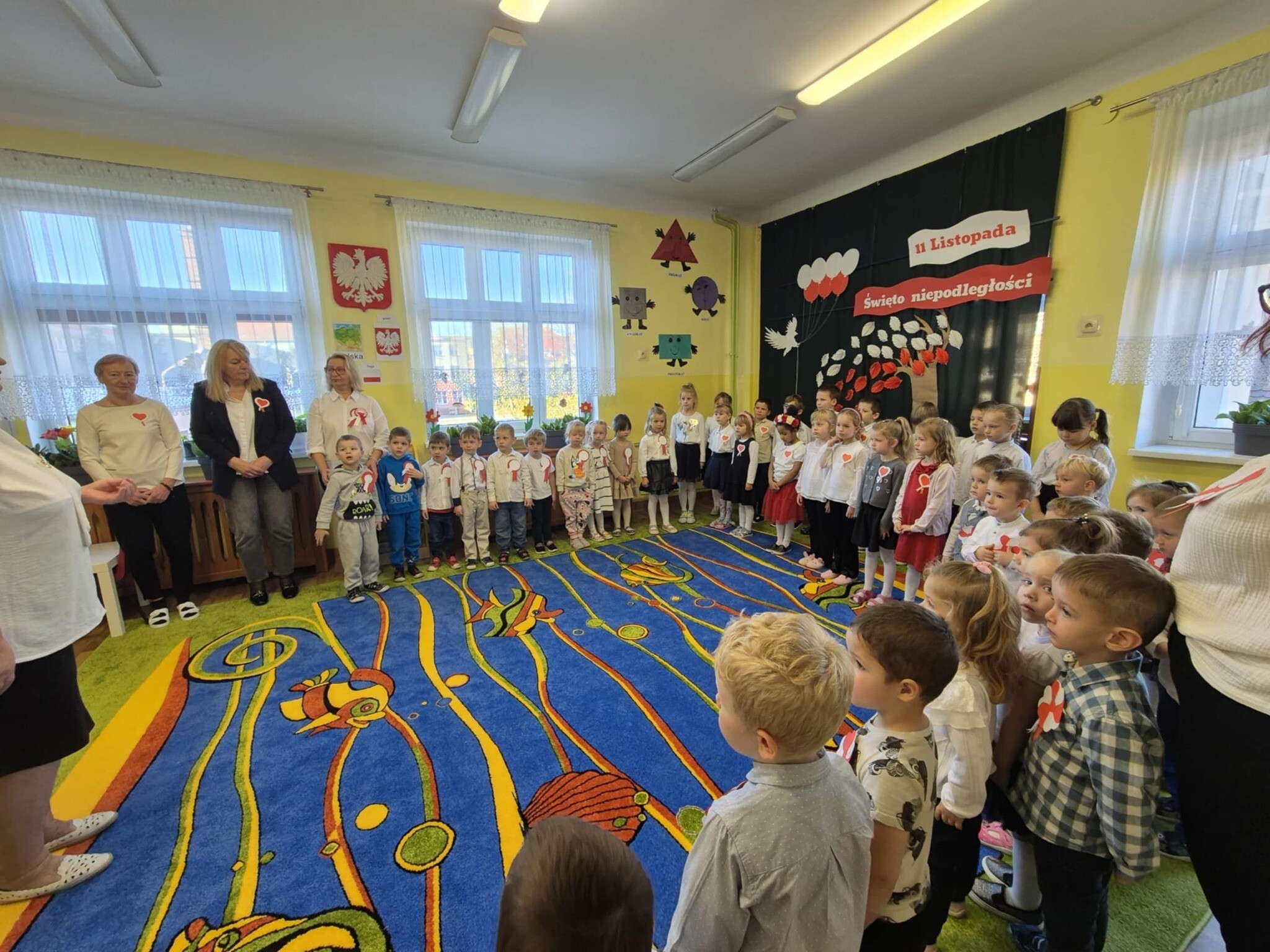 Uroczyste odśpiewanie hymnu w przedszkolu. Wyjście oraz udział dzieci z grupy ,, Sówki '' w uroczystościach przy Pomniku Bohaterów Walk o Polskę.