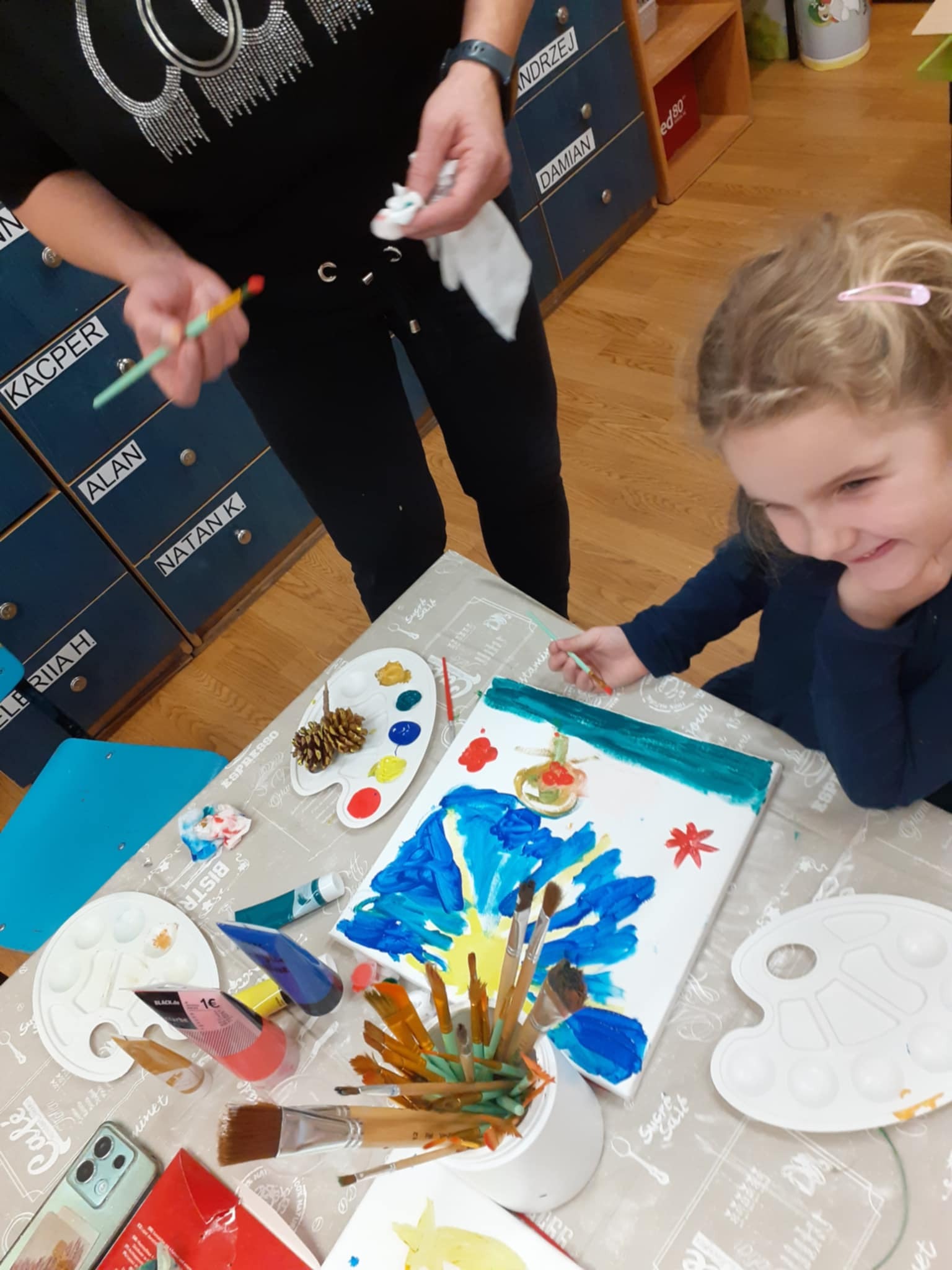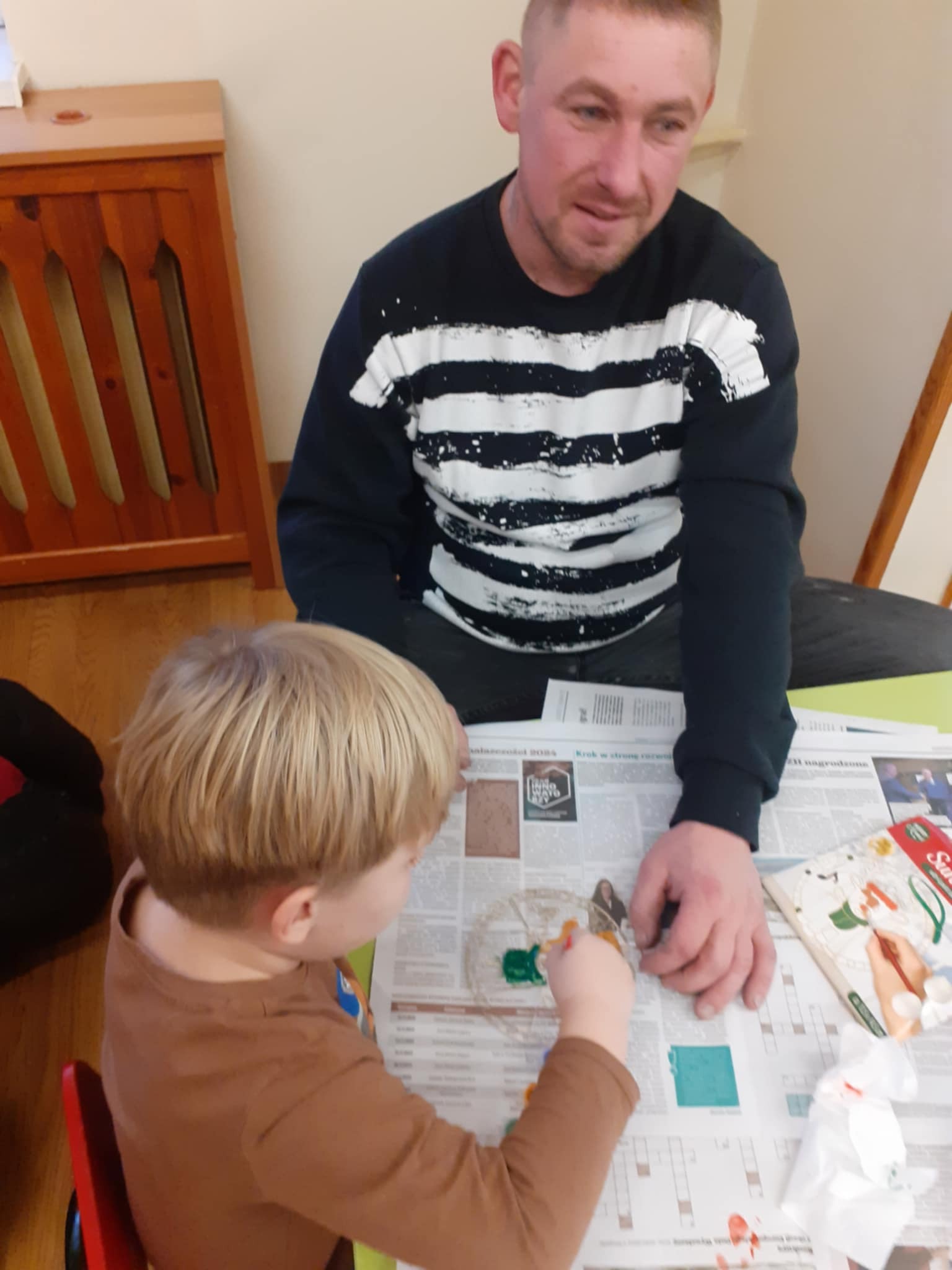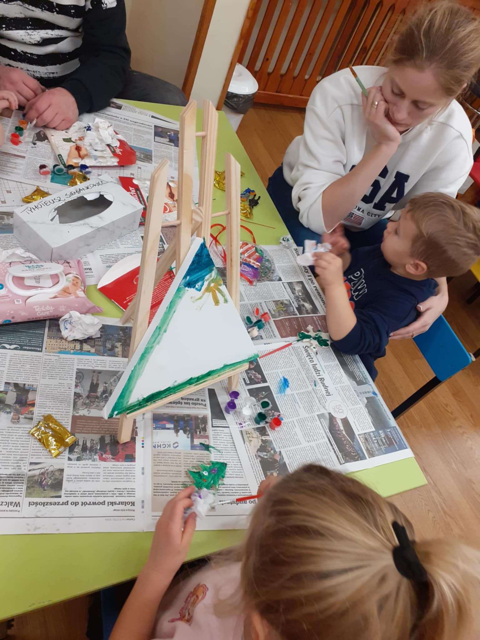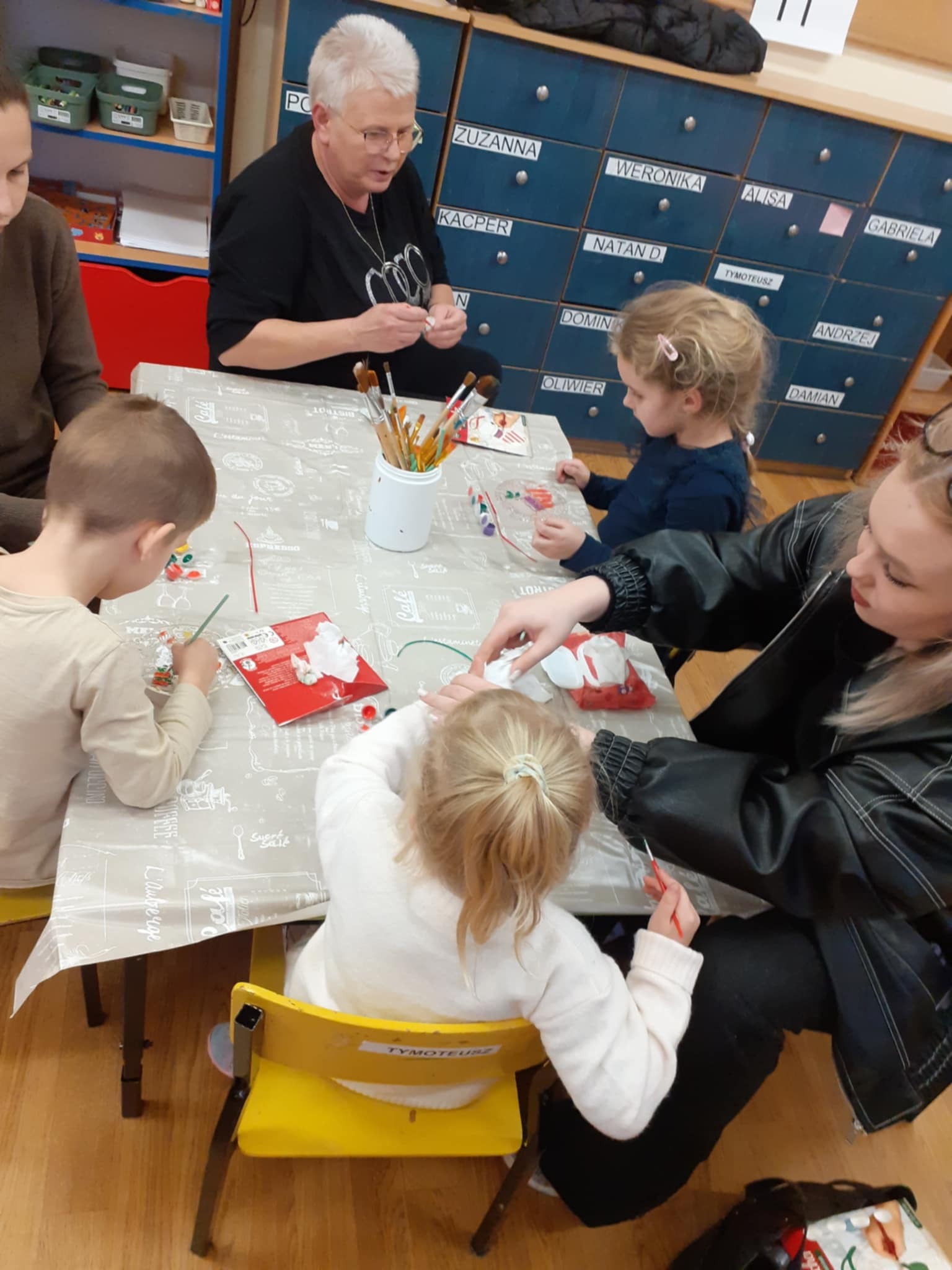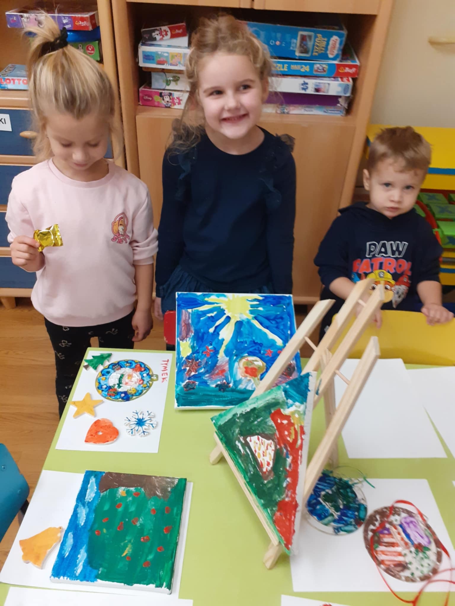 Zimowe warsztaty świąteczne w " Miśkach" - Malowanie okiennych zawieszek o tematyce mikołajkowej. Miło pędzlem wspinać się na wyżyny sztuki szczególnie, gdy rozpoczyna się tę kolorową przygodę używając sztalug i płótna malarskiego licząc sobie trzy, cztery i pięć łat . Wtedy wyobraźnia podpowiada tematy i kształty.